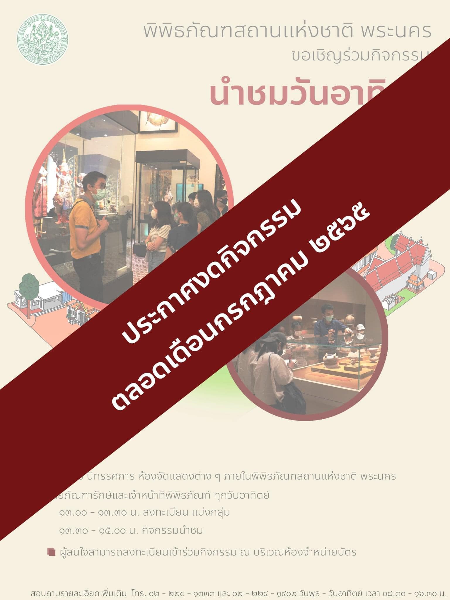 พิพิธภัณฑสถานแห่งชาติ พระนคร แจ้งของดกิจกรรม "นำชมวันอาทิตย์" ตลอดเดือนกรกฎาคม ๒๕๖๕ หากมีการเปลี่ยนแปลงพิพิธภัณฑสถานแห่งชาติ พระนคร จะประกาศให้ทราบอีกครั้ง สอบถามเพิ่มเติมทาง Inbox page และโทร. ๐๒ ๒๒๔ ๑๔๐๒, ๐๒ ๒๒๔ ๑๓๓๓