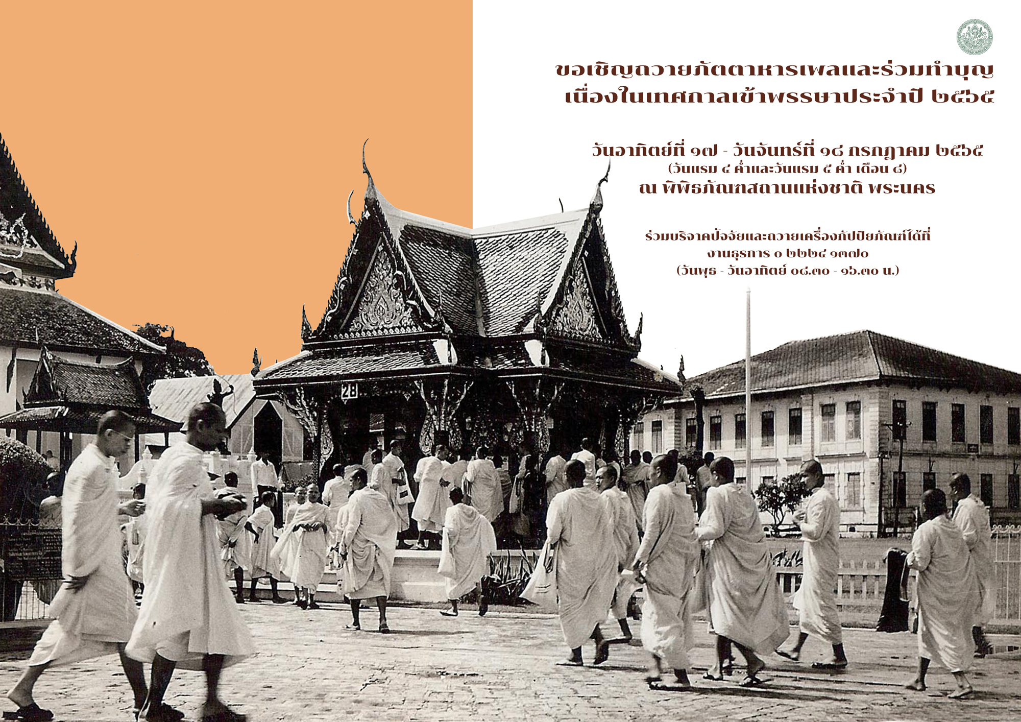 กรมศิลปากร สำนักพิพิธภัณฑสถานแห่งชาติ โดยพิพิธภัณฑสถานแห่งชาติ พระนคร ขอเชิญถวายภัตตาหารเพลแด่พระภิกษุ สามเณร และร่วมทำบุญ เนื่องในเทศกาลเข้าพรรษา ประจำปี ๒๕๖๕ ในวันที่ ๑๗ – ๑๘ กรกฎาคม ๒๕๖๕ ณ พิพิธภัณฑสถานแห่งชาติ พระนคร