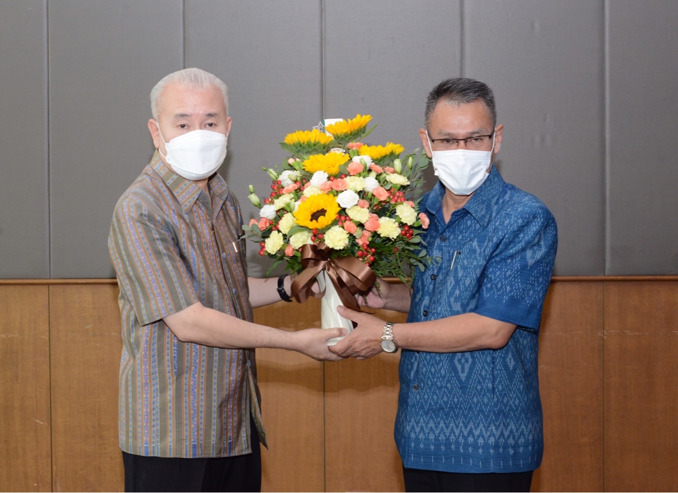 อธิบดีกรมศิลปากรมอบช่อดอกไม้แสดงความยินดีกับนายพนมบุตร จันทรโชติ ผู้ตรวจราชการกระทรวงวัฒนธรรม
