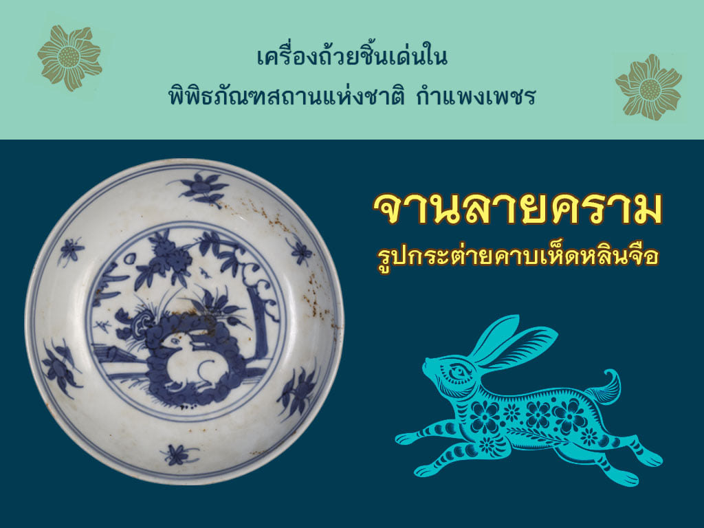 เครื่องถ้วยชิ้นเด่นในพิพิธภัณฑสถานแห่งชาติ กำแพงเพชร : จานลายครามรูปกระต่ายคาบเห็ดหลินจือ