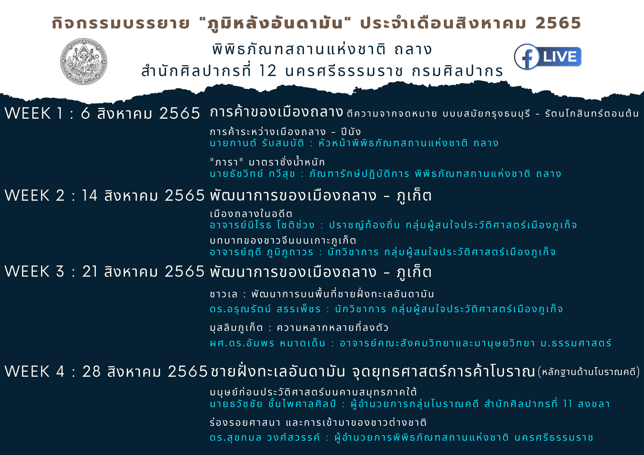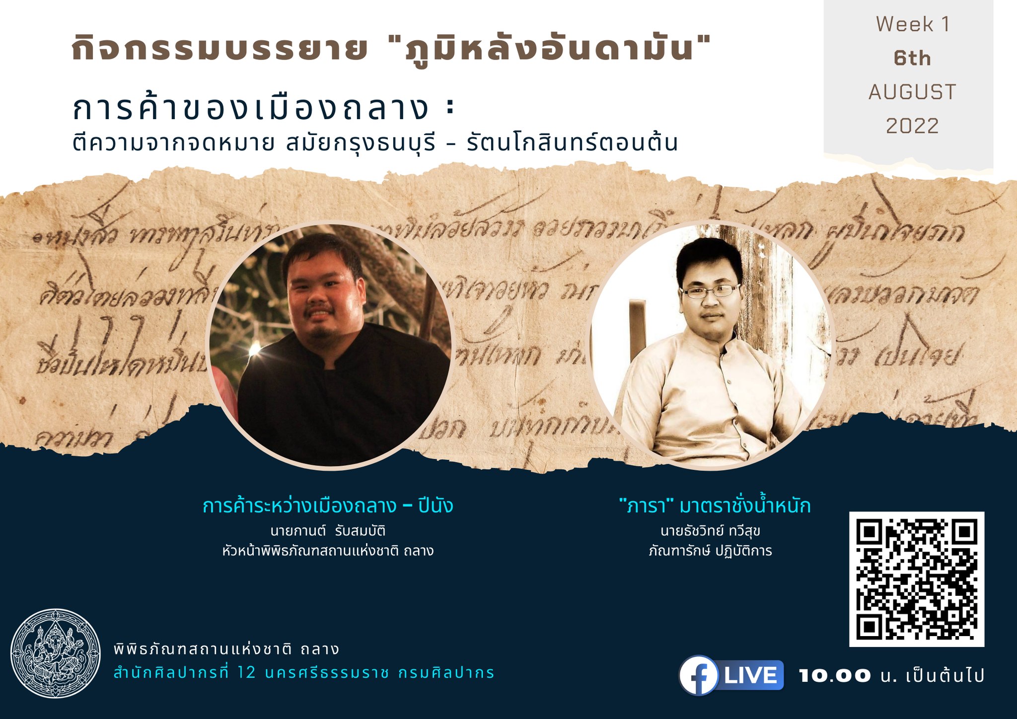 พิพิธภัณฑสถานแห่งชาติ ถลาง ขอเชิญรับชม Facebook Live การบรรยายทางวิชาการในหัวข้อ การค้าของเมืองถลาง