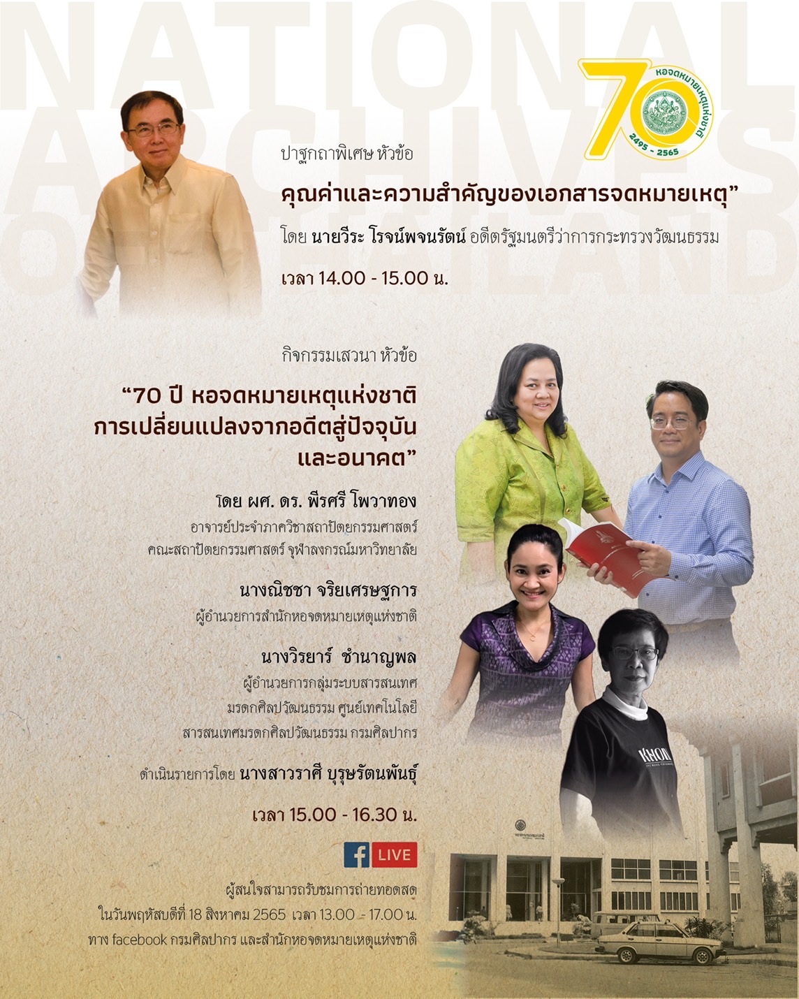 ขอเชิญรับชม Facebook Live กิจกรรมเพื่อเฉลิมฉลอง เนื่องในวาระครบรอบ 70 ปี หอจดหมายเหตุแห่งชาติ