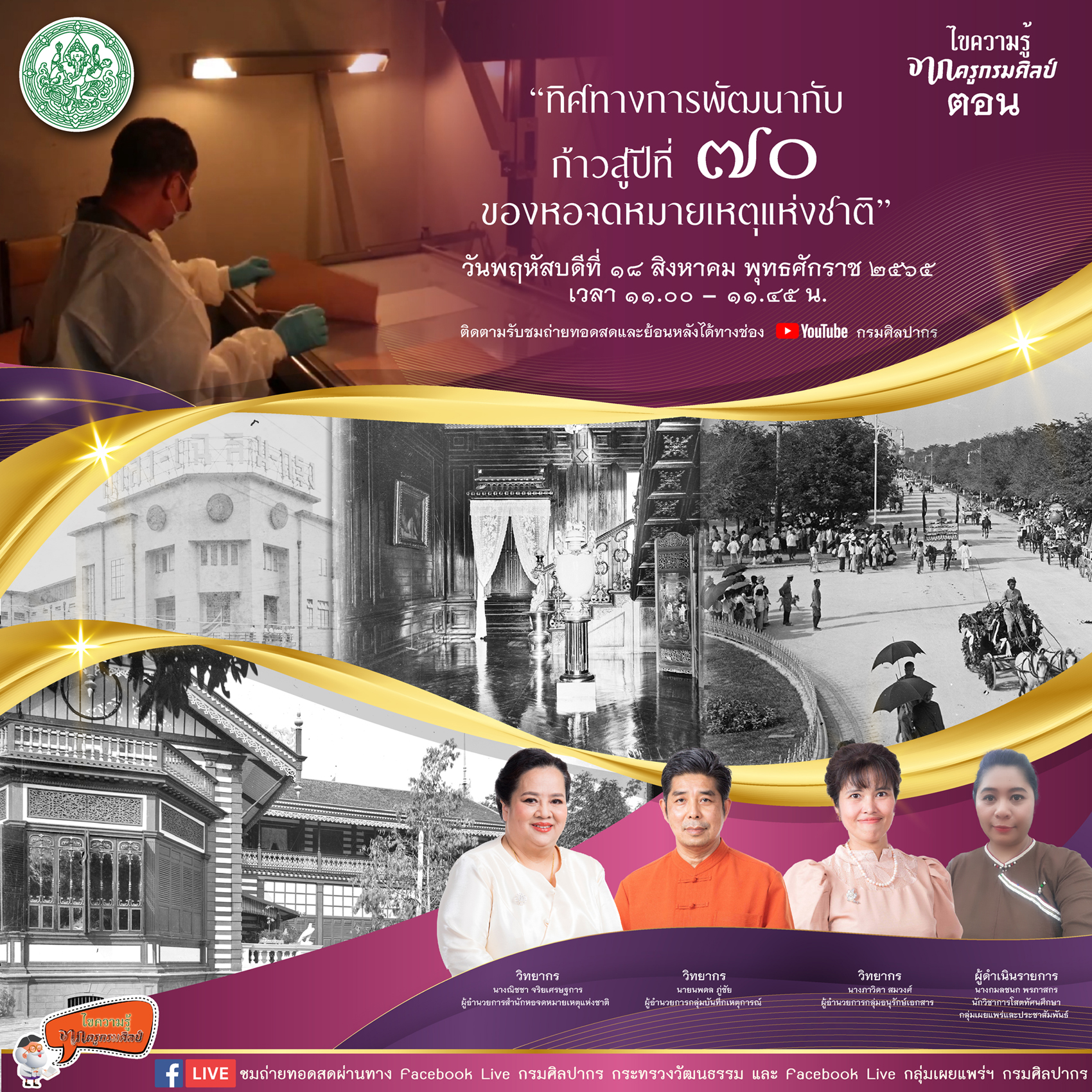 ขอเชิญรับชม Facebook Live รายการไขความรู้จากครูกรมศิลป์ ตอน “ทิศทางการพัฒนากับก้าวสู่ปีที่ ๗๐ ของหอจดหมายเหตุแห่งชาติ”