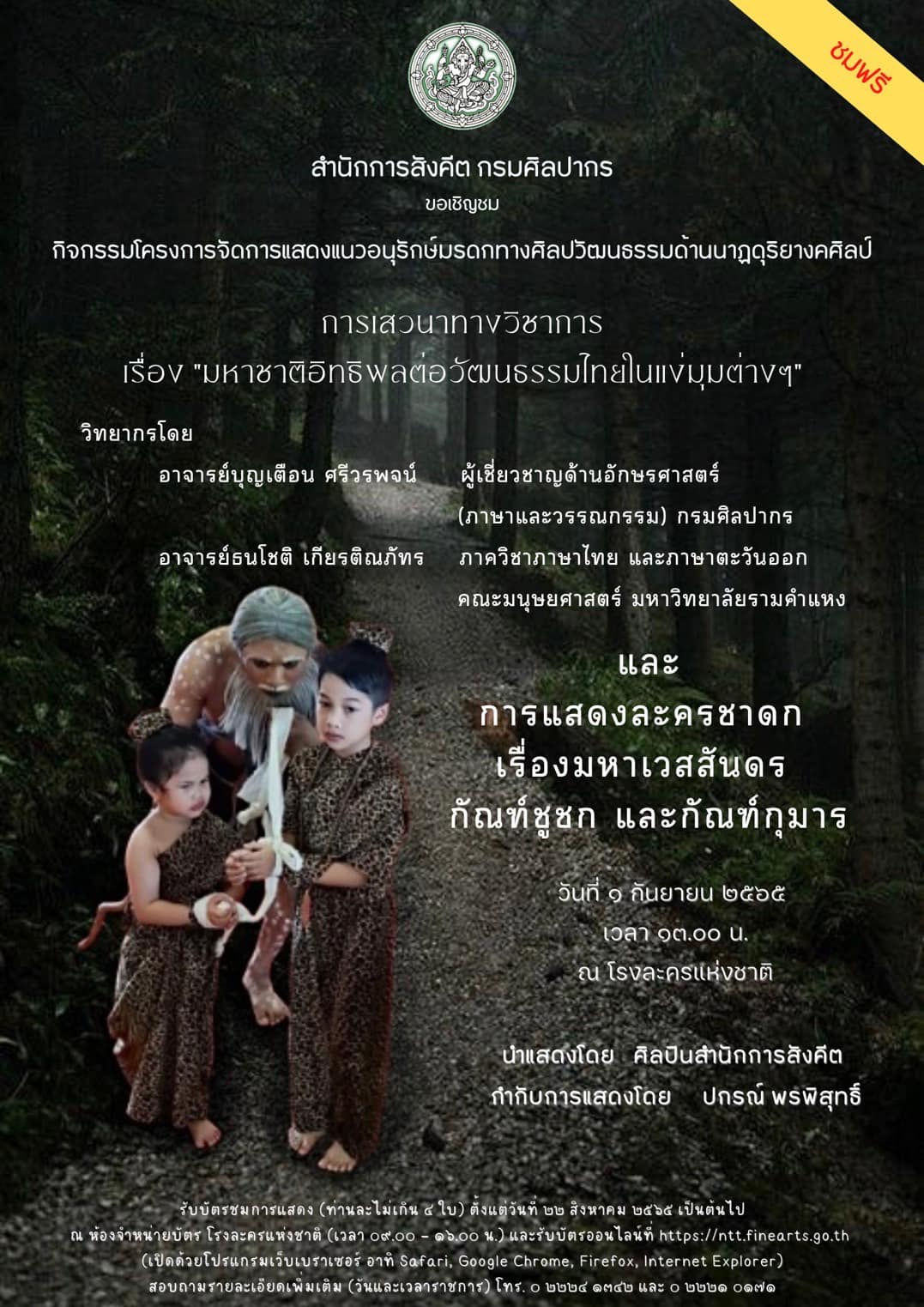 สำนักการสังคีต ขอเชิญร่วมกิจกรรมโครงการจัดการแสดงแนวอนุรักษ์มรดกทางศิลปวัฒนธรรมด้านนาฏดุริยางคศิลป์ การเสวนาทางวิชาการ เรื่อง “มหาชาติอิทธิพลต่อวัฒนธรรมไทยในแง่มุมต่างๆ” วิทยากรโดย อาจารย์บุญเตือน ศรีวรพจน์ ผู้เชี่ยวชาญด้านอักษรศาสตร์ (ภาษาและวรรณกรรม) กรมศิลปากร อาจารย์ธนโชติ เกียรติณภัทร ภาควิชาภาษาไทย และภาษาตะวันออก คณะมนุษยศาสตร์ มหาวิทยาลัยรามคำแหง พร้อมชมการแสดงละครชาดก เรื่องมหาเวสสันดร กัณฑ์ชูชก และกัณฑ์กุมาร วันที่ ๑ กันยายน ๒๕๖๕ เวลา ๑๓.๐๐ น. ณ โรงละครแห่งชาติ นำแสดงโดย ศิลปินสำนักการสังคีต กำกับการแสดงโดย ปกรณ์ พรพิสุทธิ์