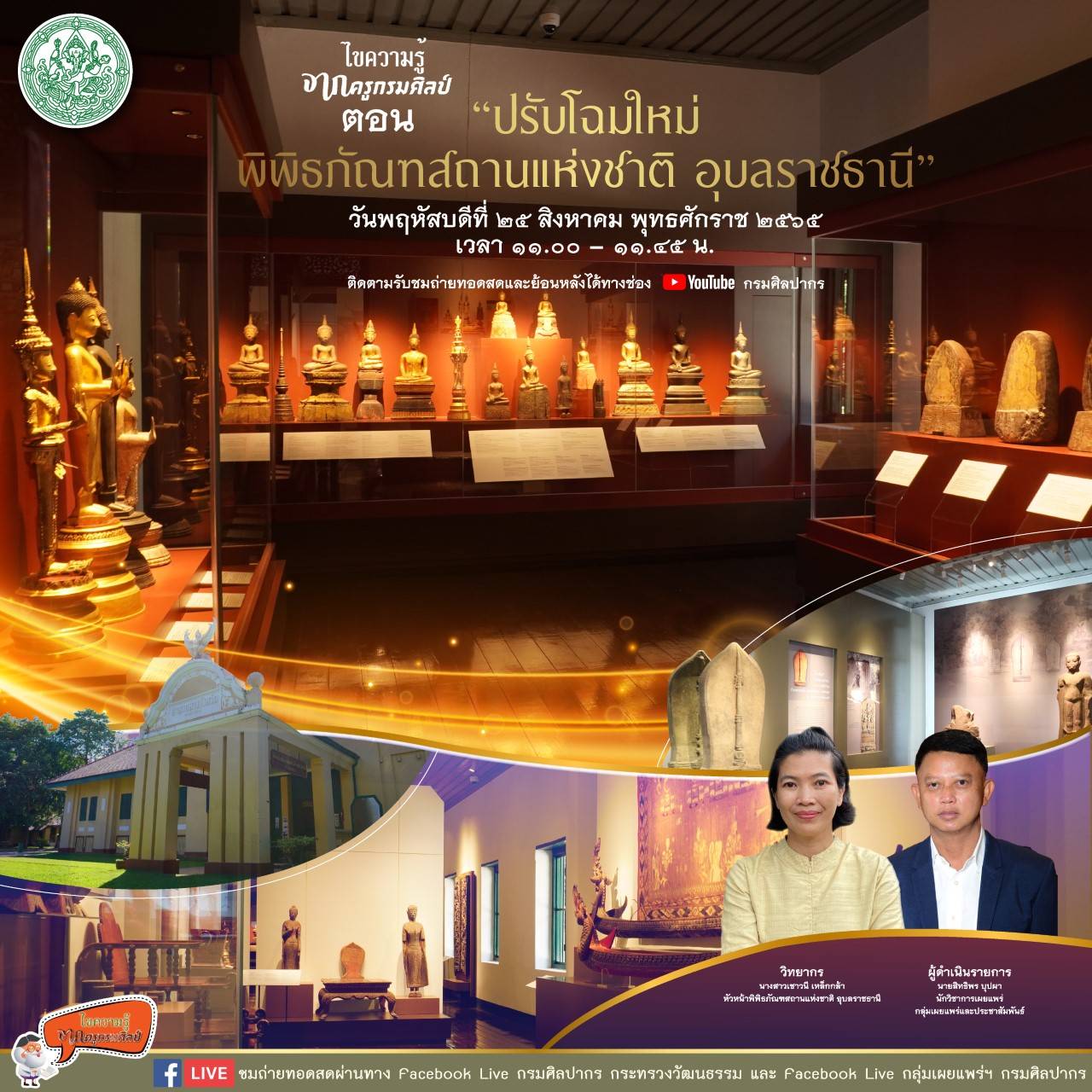 กรมศิลปากร ขอเชิญรับชมถ่ายทอดสด Facebook Live รายการไขความรู้จากครูกรมศิลป์ ตอน “ปรับโฉมใหม่ พิพิธภัณฑสถานแห่งชาติ อุบลราชธานี” วิทยากรโดย นางสาวเชาวนี เหล็กกล้า หัวหน้าพิพิธภัณฑสถานแห่งชาติ อุบลราชธานี ดำเนินรายการโดย นายสิทธิพร บุปผา นักวิชาการเผยแพร่ กลุ่มเผยแพร่และประชาสัมพันธ์ ในวันพฤหัสบดีที่ ๒๕ สิงหาคม พุทธศักราช ๒๕๖๕ ตั้งแต่เวลา ๑๑.๐๐ – ๑๑.๔๕ น.