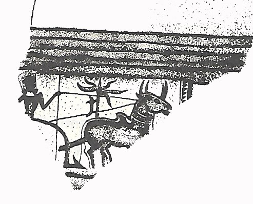 ภาพลายเส้นบนภาชนะดินเผา พบที่บ้านบางปูน ตำบลพิหารแดง อำเภอเมืองสุพรรณบุรี จังหวัดสุพรรณบุรี ตกแต่งลายกดประทับรูปบุคคล คันไถและวัวคู่ อาจหมายถึงพิธีแรกนาขวัญ แสดงถึงการให้ความสำคัญในเรื่องการปลูกข้าวหรือเกษตรกรรมของผู้ปกครองรัฐสุพรรณภูมิ เมื่อพุทธศตวรรษที่ 19-20 หรือประมาณ 600-700 ปีมาแล้ว