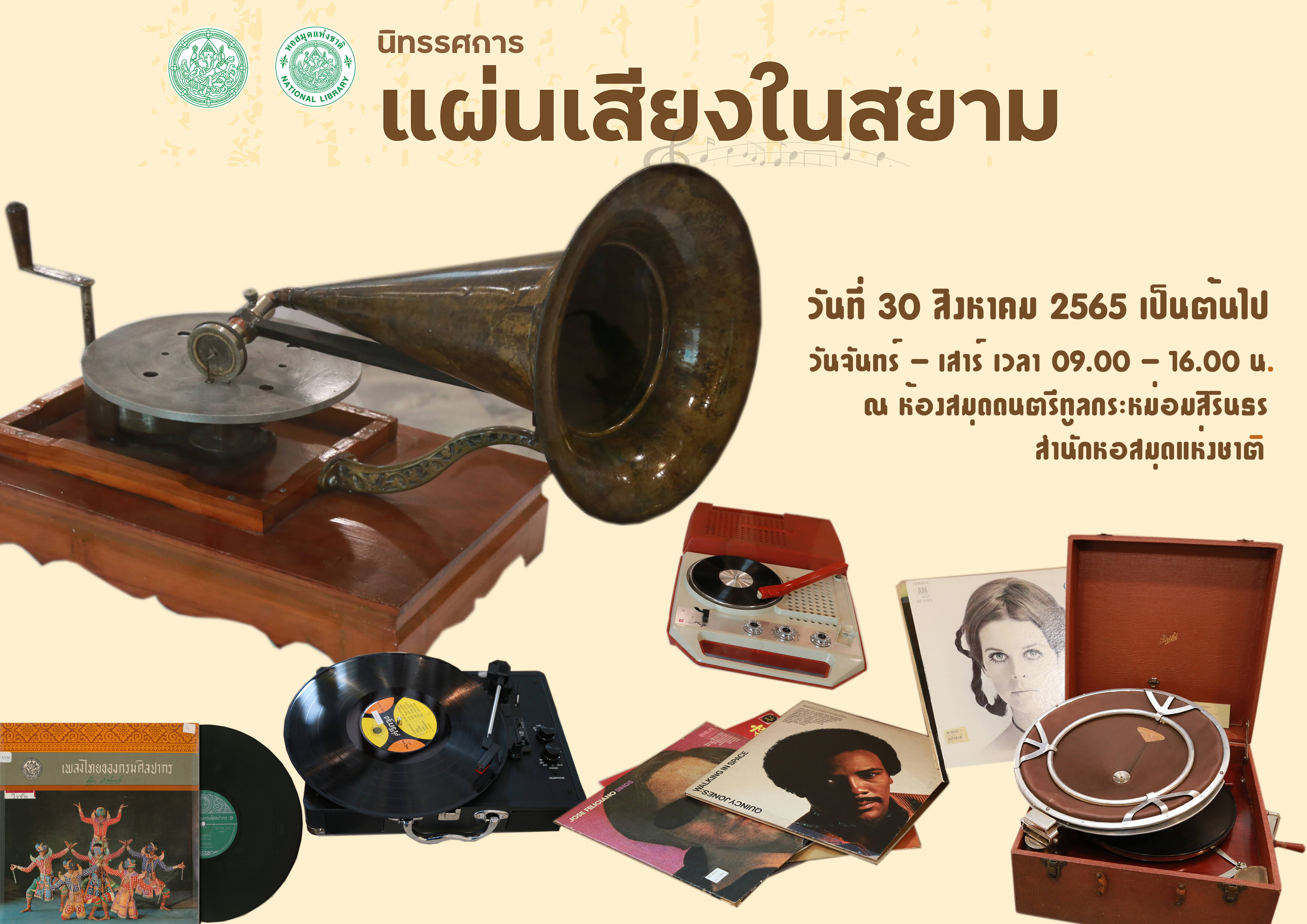ขอเชิญชวนผู้สนใจเข้าชมนิทรรศการ “แผ่นเสียงในสยาม” ณ ห้องจัดแสดง ชั้น ๑ อาคารห้องสมุดดนตรีทูลกระหม่อมสิรินธร สำนักหอสมุดแห่งชาติ เปิดให้ชมวันจันทร์ - วันเสาร์ เวลา ๐๙.๐๐ - ๑๖.๐๐ น.