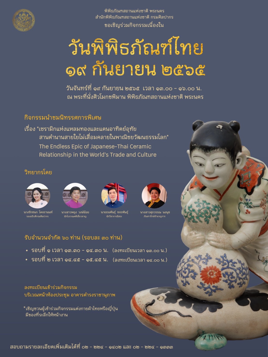 นอกจากนี้ยังมีกิจกรรมนำผู้สนใจเข้าชมนิทรรศการพิเศษ เรื่อง “เซรามิกแห่งแหลมทองและแดนอาทิตย์อุทัย : สานสายใยไม่เสื่อมคลายในพาณิชยวัฒนธรรมโลก” ณ พระที่นั่งศิวโมกขพิมาน พิพิธภัณฑสถานแห่งชาติ พระนคร ในวันจันทร์ที่ ๑๙ กันยายน ๒๕๖๕ เวลา ๑๓.๐๐ - ๑๖.๐๐ น. บรรยายนำชมโดยวิทยากรจากทีมงานผู้จัดนิทรรศการฯ ทั้งนักโบราณคดี ภัณฑารักษ์และนักวิชาการอิสระ และเพื่อให้ผู้เข้าร่วมกิจกรรมสามารถเข้าชมและฟังการบรรยายได้อย่างทั่วถึง จึงจัดการเข้าชมเป็นสองรอบคือ รอบแรกเวลา ๑๓.๓๐ น. (ลงทะเบียน เวลา ๑๓.๐๐ น.) และรอบที่สองเวลา ๑๔.๔๕ น. (ลงทะเบียนเวลา ๑๔.๐๐ น.) รอบละ ๓๐ คนเท่านั้น ผู้สนใจลงทะเบียนเข้าร่วมกิจกรรมได้ที่หน้าห้องประชุม อาคารดำรงราชานุภาพ สอบถามรายละเอียดเพิ่มเติมที่หมายเลขโทรศัพท์ ๐ ๒๒๒๔ ๑๔๐๒ และ ๐ ๒๒๒๔ ๑๓๓๓ เวลา ๐๘.๓๐ น. – ๑๖.๓๐ น. วันพุธ - วันอาทิตย์