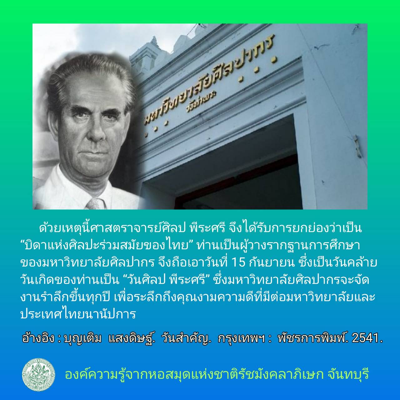 ด้วยเหตุนี้ศาสตราจารย์ศิลป พีระศรี จึงได้รับการยกย่องว่าเป็น “บิดาแห่งศิลปะร่วมสมัยของไทย” ท่านเป็นผู้วางรากฐานการศึกษาของมหาวิทยาลัยศิลปากร จึงถือเอาวันที่ 15 กันยายน ซึ่งเป็นวันคล้ายวันเกิดของท่านเป็น “วันศิลป พีระศรี” ซึ่งมหาวิทยาลัยศิลปากรจะจัดงานรำลึกขึ้นทุกปี เพื่อระลึกถึงคุณงามความดีที่มีต่อมหาวิทยาลัยและประเทศไทยนานัปการ