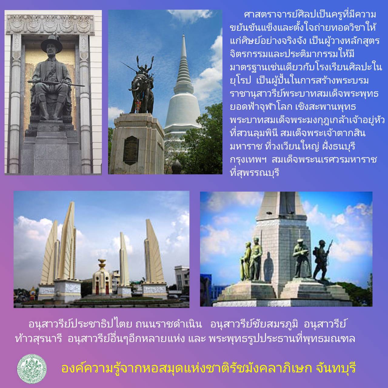 ศาสตราจารย์ศิลปเป็นครูที่มีความขยันขันแข็งและตั้งใจถ่ายทอดวิชาให้แก่ศิษย์อย่างจริงจัง เป็นผู้วางหลักสูตรจิตรกรรมและประติมากรรมให้มีมาตรฐานเช่นเดียวกับโรงเรียนศิลปะในยุโรป เป็นผู้ปั้นในการสร้างพระบรมราชานุสาวรีย์พระบาทสมเด็จพระพุทธยอดฟ้าจุฬาโลก เชิงสะพานพุทธ พระบาทสมเด็จพระมงกุฎเกล้าเจ้าอยู่หัว ที่สวนลุมพินี สมเด็จพระเจ้าตากสินมหาราช ที่วงเวียนใหญ่ ฝั่งธนบุรี กรุงเทพฯ สมเด็จพระนเรศวรมหาราช ที่สุพรรณบุรี อนุสาวรีย์ประชาธิปไตย ถนนราชดำเนิน อนุสาวรีย์ชัยสมรภูมิ อนุสาวรีย์ท้าวสุรนารี อนุสาวรีย์อื่นๆอีกหลายแห่ง และ พระพุทธรูปประธานที่พุทธมณฑล