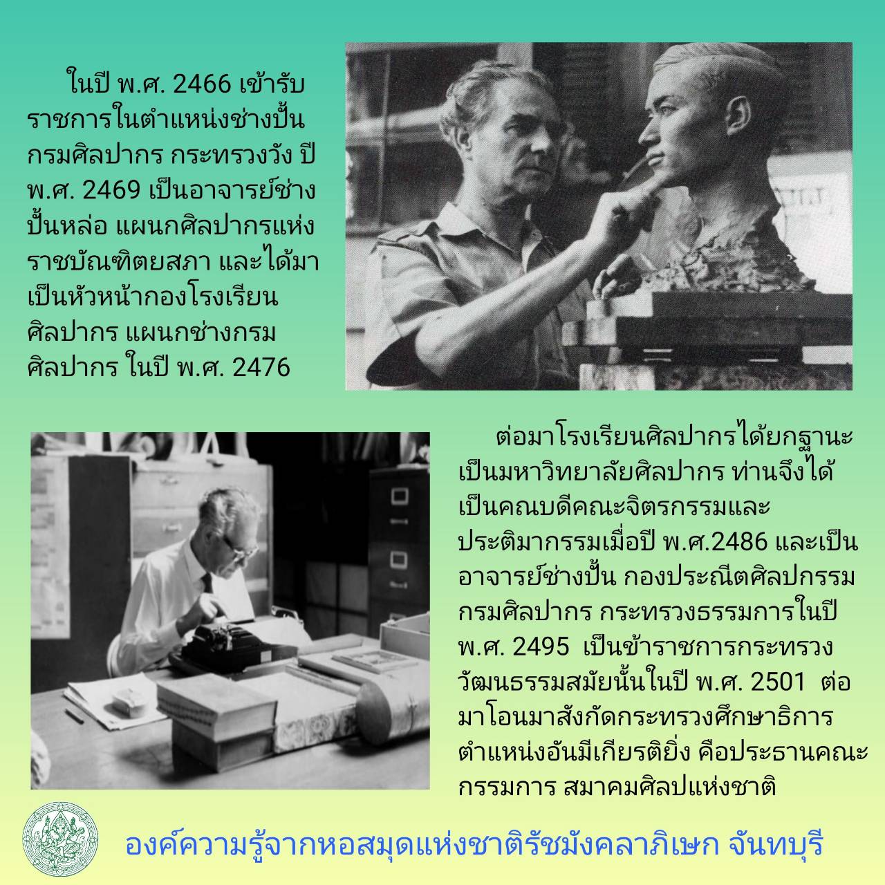 ในปี พ.ศ. 2466 เข้ารับราชการในตำแหน่งช่างปั้น กรมศิลปากร กระทรวงวัง ปี พ.ศ. 2469 เป็นอาจารย์ช่างปั้นหล่อ แผนกศิลปากรแห่งราชบัณฑิตยสภา และได้มาเป็นหัวหน้ากองโรงเรียนศิลปากร แผนกช่างกรมศิลปากร ในปี พ.ศ. 2476 ต่อมาโรงเรียนศิลปากรได้ยกฐานะเป็นมหาวิทยาลัยศิลปากร ท่านจึงได้เป็นคณบดีคณะจิตรกรรมและประติมากรรมเมื่อปี พ.ศ.2486 และเป็นอาจารย์ช่างปั้น กองประณีตศิลปกรรม กรมศิลปากร กระทรวงธรรมการในปี พ.ศ. 2495 เป็นข้าราชการกระทรวงวัฒนธรรมสมัยนั้นในปี พ.ศ. 2501 ต่อมาโอนมาสังกัดกระทรวงศึกษาธิการ ตำแหน่งอันมีเกียรติยิ่ง คือประธานคณะกรรมการ สมาคมศิลปแห่งชาติ