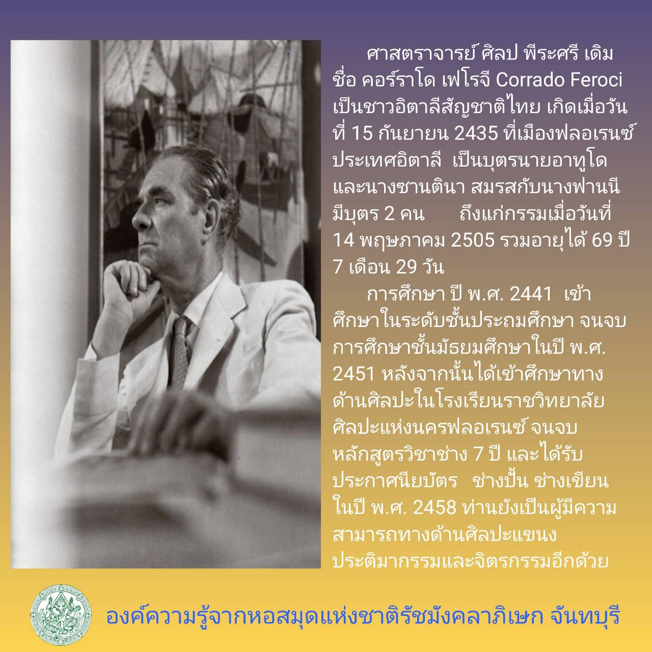 ศาสตราจารย์ ศิลป พีระศรี เดิมชื่อ คอร์ราโด เฟโรจี Corrado Feroci เป็นชาวอิตาลีสัญชาติไทย เกิดเมื่อวันที่ 15 กันยายน 2435 ที่เมืองฟลอเรนซ์ ประเทศอิตาลี เป็นบุตรนายอาทูโด และนางซานตินา สมรสกับนางฟานนี มีบุตร 2 คน ถึงแก่กรรมเมื่อวันที่ 14 พฤษภาคม 2505 รวมอายุได้ 69 ปี 7 เดือน 29 วัน
