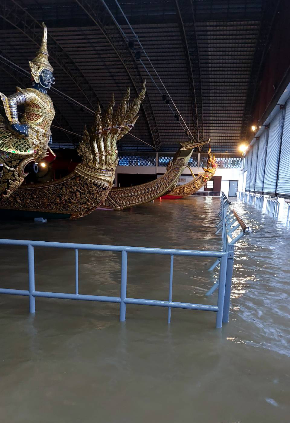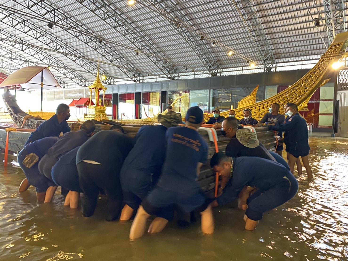 จากสถานการณ์น้ำในคลองบางกอกน้อยที่เพิ่มสูงขึ้นตั้งแต่เดือนกันยายนที่ผ่านมา กรมศิลปากร ได้ติดตามสถานการณ์และเฝ้าระวังอย่างใกล้ชิด โดยระหว่างวันที่ 5 - 13 ตุลาคมนี้ น้ำทะเลจะหนุนสูง ประกอบกับมีมรสุม และการระบายน้ำท้ายเขื่อนเจ้าพระยา ทำให้ระดับน้ำในแม่น้ำเจ้าพระยาเพิ่มขึ้นสูง ส่งผลกระทบต่อพิพิธภัณฑสถานแห่งชาติ เรือพระราชพิธี ซึ่งตั้งอยู่ริมคลองบางกอกน้อย จึงเตรียมมาตรการรับมือเพื่อปกป้องเรือพระราชพิธีและวัตถุจัดแสดง ตามแผนบริหารความเสี่ยงจากเหตุอุทกภัยที่สำนักพิพิธภัณฑสถานแห่งชาติและกรมอู่ทหารเรือร่วมกันจัดทำไว้เมื่อปีที่ผ่านมา โดยเริ่มจากประสานอู่ทหารเรือธนบุรี เข้าร่วมตรวจสอบสภาพหมอนรองรับเรือพระราชพิธีทุกคานทุกลำและดำเนินการแก้ไขให้มีความมั่นคงแข็งแรง จากนั้นยกคานเรือพระราชพิธีขึ้นในระดับสูงสุด ผูกรัดเรือพระราชพิธีทุกลำ และเปิดวาล์วเรือพระที่นั่งเพื่อลดผลกระทบจากน้ำต่อโครงสร้างของเรือ แล้วจัดเก็บวัตถุจัดแสดงให้อยู่ในพื้นที่สูง เสริมความมั่นคงแข็งแรงให้กับโบราณวัตถุที่มีความเปราะบาง และจัดทำสะพานทางเดินชั่วคราวสำหรับเจ้าหน้าที่ปฏิบัติงานระหว่างน้ำขึ้นท่วมทางเดิน สำหรับระดับน้ำล่าสุดเมื่อวันที่ 6 ตุลาคม ระดับน้ำท่วมในช่วงน้ำขึ้นสูงสุด 74 เซนติเมตรจากทางเดินปกติ