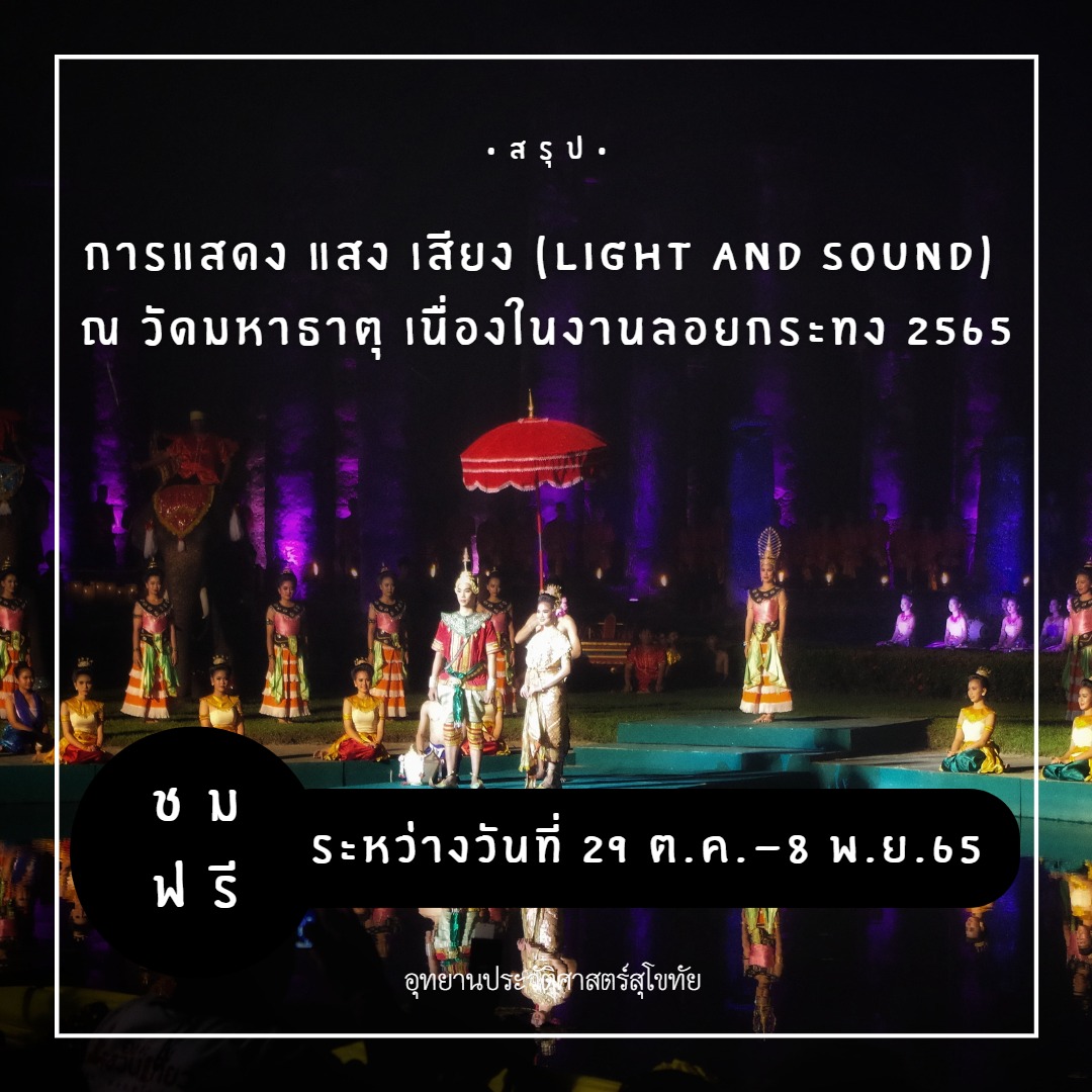 อุทยานประวัติศาสตร์สุโขทัย ขอเชิญชวนประชาชนร่วมงานลอยกระทง เผาเทียน เล่นไฟ จังหวัดสุโขทัย 2565 จัดขึ้นระหว่างวันที่ 29 ตุลาคม ถึง 8 พฤศจิกายน 2565 ภายในงานพบกับการเเสดงเเสงเสียง Light & Sound 2022 สุโขทัย การเเสดงพลุ ตะไล ไฟพะเนียง การแสดงศิลปวัฒนธรรม การเเสดงกระบี่กระบอง การเเสดงโขน ละคร หุ่น การประกวดนางนพมาศ รวมทั้งเลือกซื้อสินค้าในตลาดถุงเงิน ณ วัดตระพังเงิน ตลาดแลกเบี้ย ณ บริเวณสระยายเพิ้ง ตลาดปสาน ณ บริเวณด้านหลังวัดชนะสงคราม และตลาดบ้าน บ้าน ณ บริเวณด้านหลังวัดชนะสงคราม