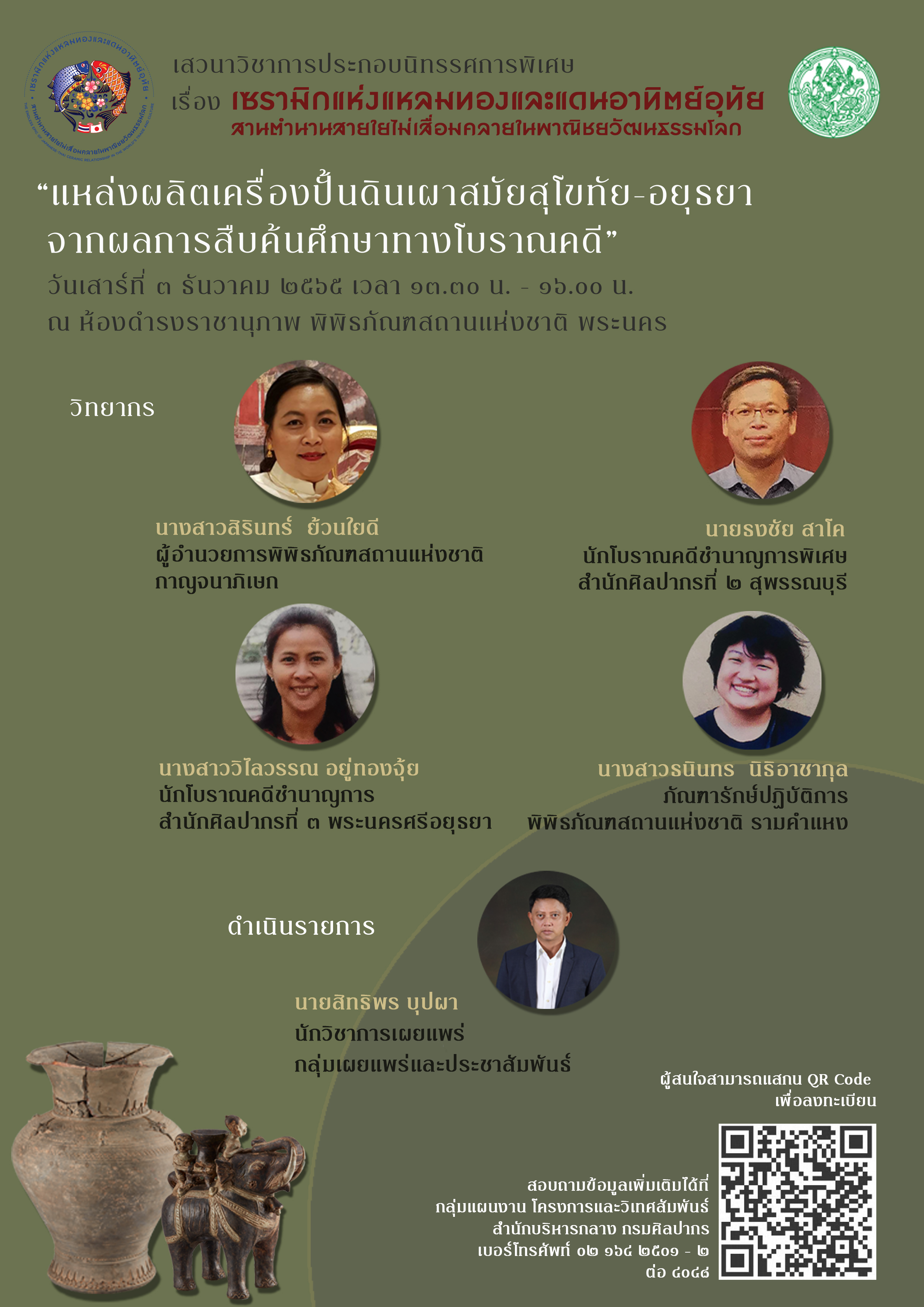 กรมศิลปากร ขอเชิญร่วมฟังการเสวนาทางวิชาการประกอบนิทรรศการพิเศษ เรื่อง “เซรามิกแห่งแหลมทองและแดนอาทิตย์อุทัย : สานตำนานสายใยไม่เสื่อมคลายในพาณิชยวัฒนธรรมโลก” ในหัวข้อ “แหล่งผลิตเครื่องปั้นดินเผาสมัยสุโขทัย - อยุธยา จากผลการสืบค้นศึกษาทางโบราณคดี” โดยวิทยากร นางสาวสิรินทร์ ย้วยใยดี ผู้อำนวยการพิพิธภัณฑสถานชาติ กาญจนาภิเษก นายธงชัย สาโท นักโบราณคดีชำนาญการพิเศษ สำนักศิลปากรที่ ๒ สุพรรณบุรี นางสาววิไลวรรณ อยู่ทองจุ้ย นักโบราณคดีชำนาญการ สำนักศิลปากรที่ ๓ พระนครศรีอยุธยา และนางสาวธนินทร นิธิอาชากุล ภัณฑารักษ์ปฏิบัติการ พิพิธภัณฑสถานแห่งชาติ รามคำแหง ในวันเสาร์ที่ ๓ ธันวาคม ๒๕๖๕ เวลา ๑๓.๐๐ - ๑๖.๐๐ น. ณ ห้องประชุมอาคารดำรงราชานุภาพ พิพิธภัณฑสถานแห่งชาติ พระนคร