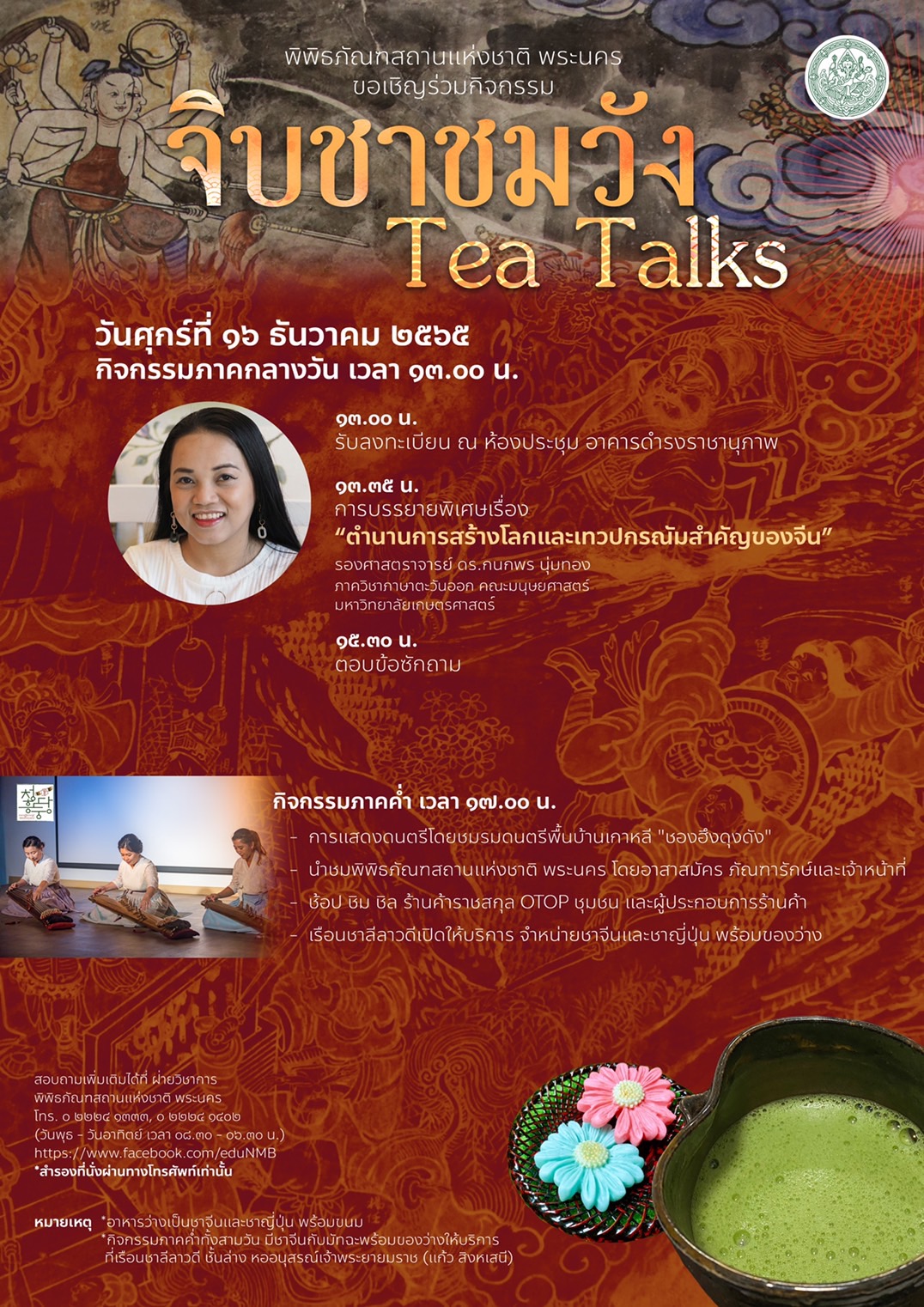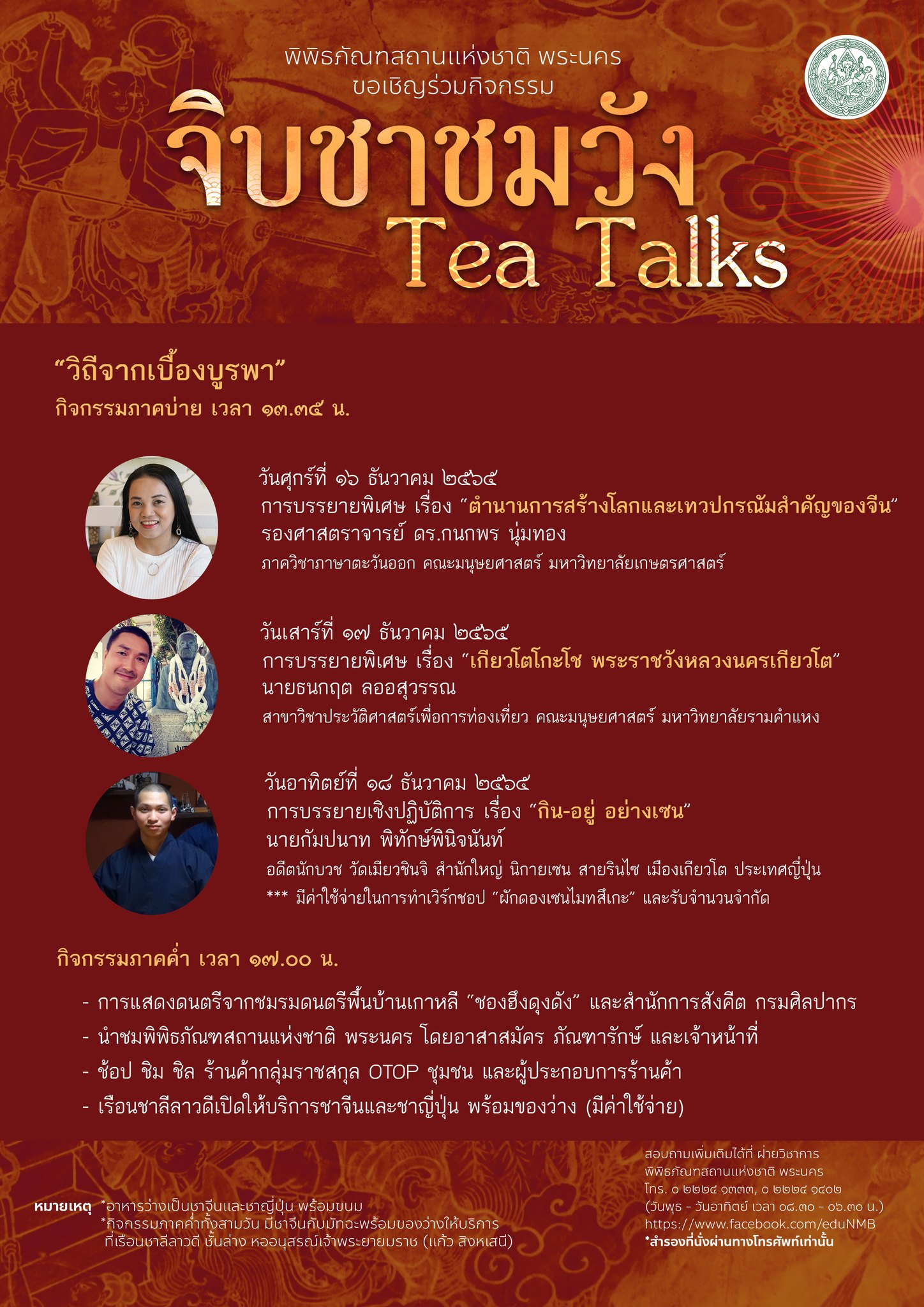 พิพิธภัณฑสถานแห่งชาติ พระนคร ขอเชิญชวนผู้สนใจเข้าร่วมกิจกรรม "จิบชาชมวัง" ปี ๒ "วิถีแห่งเบื้องบูรพา" ระหว่างวันที่ ๑๖-๑๘ ธันวาคม ๒๕๖๕ พบกับกิจกรรมภาคบ่าย เวลา ๑๓.๓๕ น. ณ ห้องประชุม อาคารดำรงราชานุภาพ โดยมีหัวข้อการบรรยายที่น่าสนใจ ดังนี้