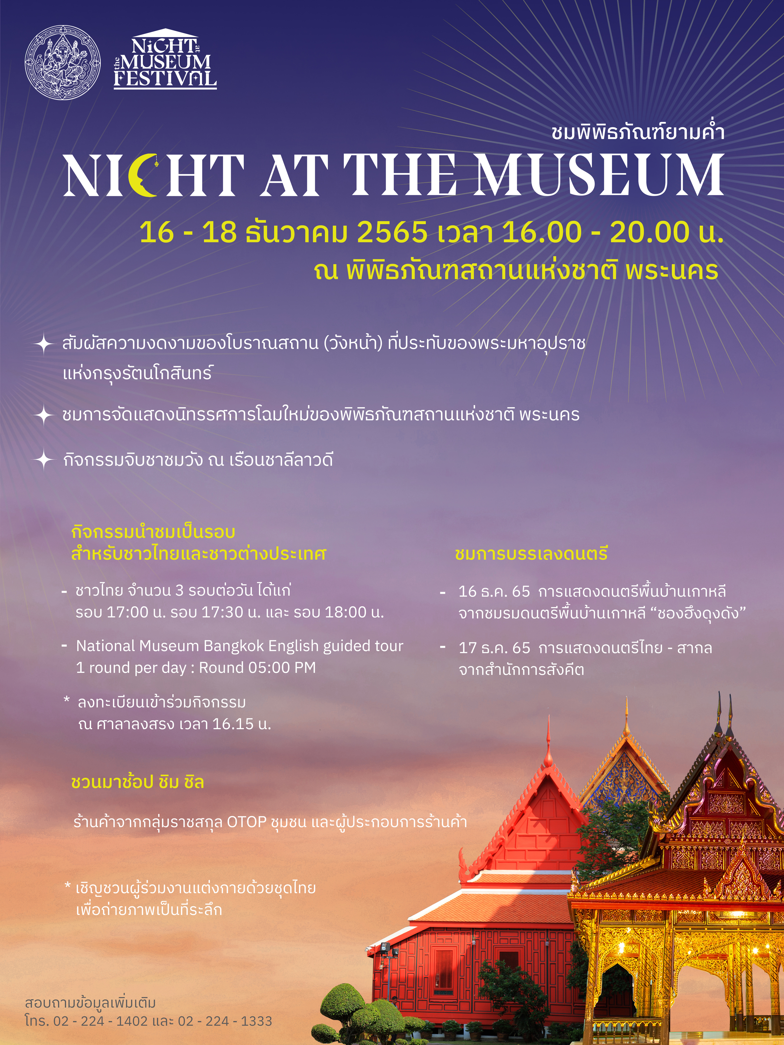 - นำชมพิพิธภัณฑสถานแห่งชาติ พระนคร โดยอาสาสมัคร ภัณฑารักษ์ และเจ้าหน้าที่ (Night at the Museum) เวลา ๑๖.๐๐ - ๒๐.๐๐ น. นำชม วันละ ๓ รอบ รอบแรก เวลา ๑๗.๐๐ น. รอบที่ ๒ เวลา ๑๗.๓๐ น. และรอบที่ ๓ เวลา ๑๘.๐๐ น. ลงทะเบียนวันงานบริเวณศาลาลงสรง