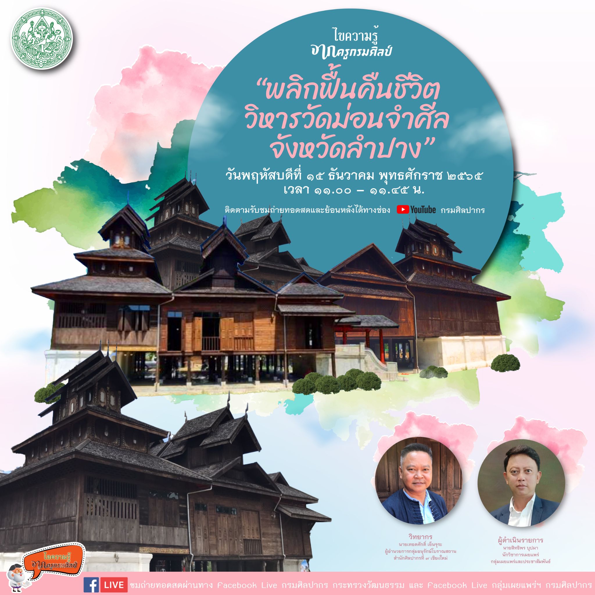 ขอเชิญรับชม Facebook Live รายการไขความรู้จากครูกรมศิลป์ “พลิกฟื้นคืนชีวิต วิหารวัดม่อนจำศีล จังหวัดลำปาง”