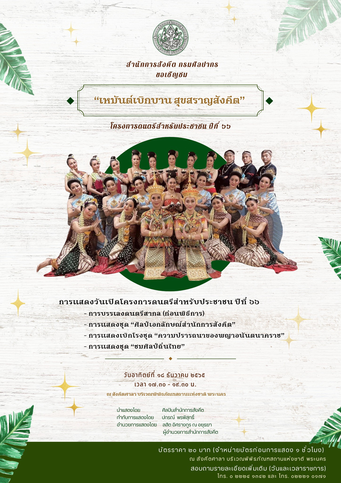 ขอเชิญชวนผู้สนใจเข้าชมการแสดงรายการ “เหมันต์เบิกบาน สุขสราญสังคีต” โครงการดนตรีสำหรับประชาชน ปีที่ ๖๖ ติดตามรายละเอียดเพิ่มเติมได้ที่เว็บไซต์กรมศิลปากร finearts.go.th และเฟสบุ๊ก เพจ สำนักการสังคีต กรมศิลปากร