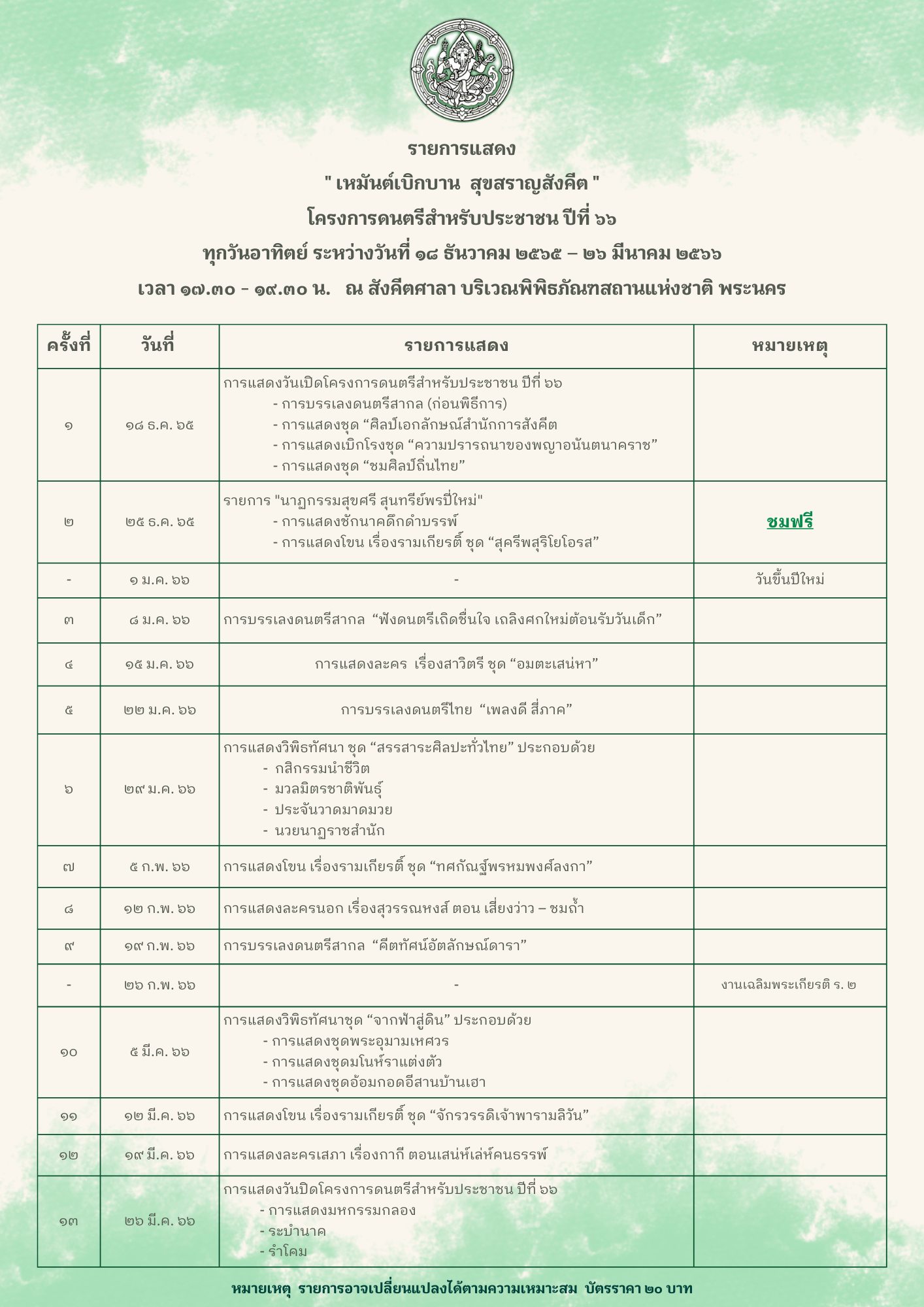 กรมศิลปากร โดยสำนักการสังคีต จัดการแสดงรายการ "เหมันต์เบิกบาน สุขสราญสังคีต" โครงการดนตรีสำหรับประชาชน ปีที่ ๖๖ ซึ่งเป็นการแสดงประจำปีของสำนักการสังคีต เพื่อเผยแพร่และอนุรักษ์ศิลปวัฒนธรรม โดยมีการแสดงหลากหลายรูปแบบทั้งการแสดงโขน ละคร วิพิธทัศนา การบรรเลงดนตรีไทย ดนตรีสากล โดยศิลปินของสำนักการสังคีต กรมศิลปากร กำหนดจัดการแสดงทุกวันอาทิตย์ ระหว่างวันอาทิตย์ที่ ๑๘ ธันวาคม ๒๕๖๕ ถึงวันอาทิตย์ที่ ๒๖ มีนาคม ๒๕๖๖ เวลา ๑๗.๓๐ - ๑๙.๓๐ น. ณ สังคีตศาลา เวทีกลางแจ้ง บริเวณพิพิธภัณฑสถานแห่งชาติ พระนคร ค่าเข้าชมการแสดงคนละ ๒๐ บาท