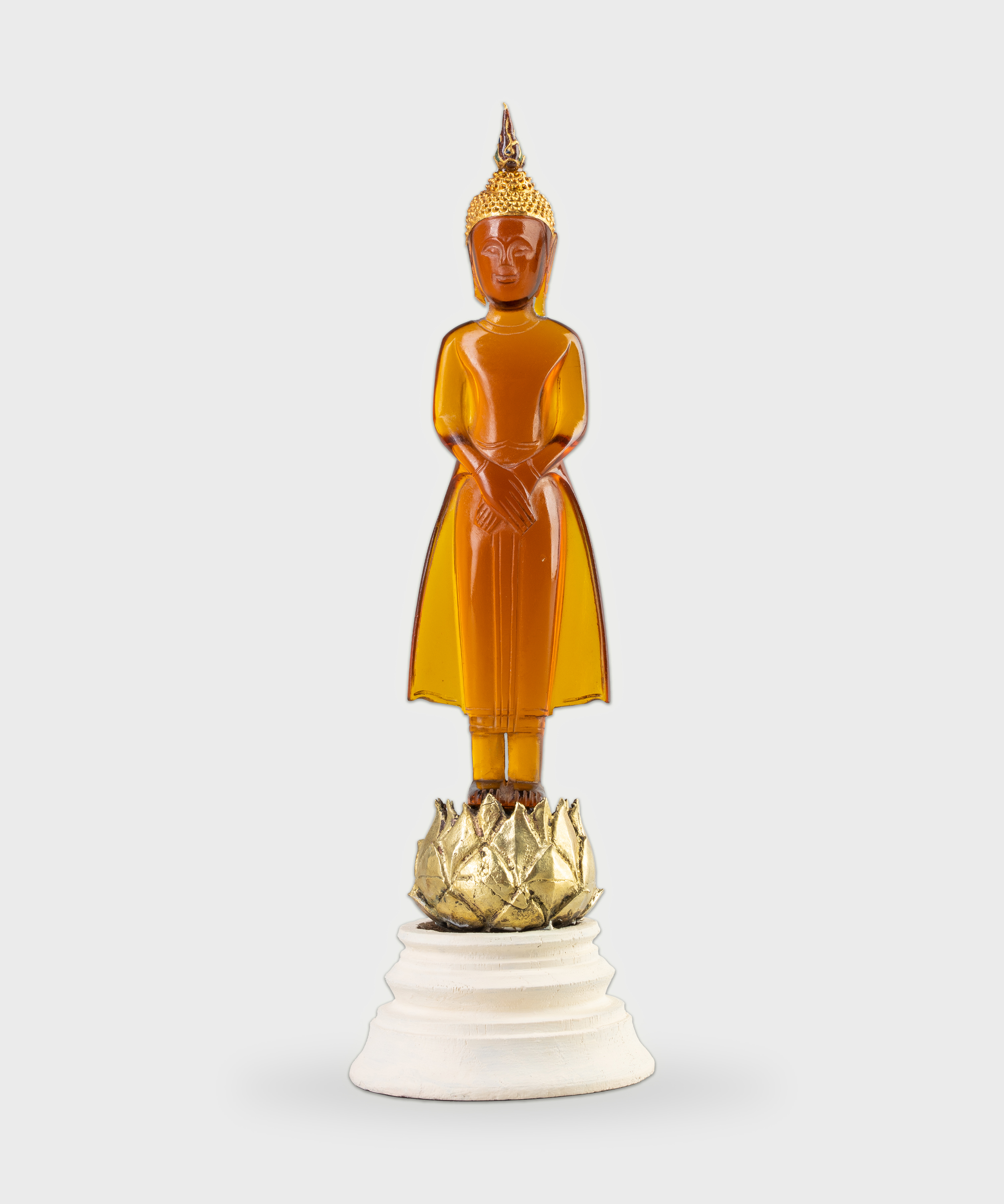 พระพุทธรูปปางถวายเนตร อิริยาบถทรงยืนประสานพระหัตถ์ขวาวางไขว้ทับบนพระหัตถ์ซ้ายบริเวณ พระเพลา เหตุการณ์ในสัปดาห์ที่ ๒ หลังจากพระพุทธเจ้าตรัสรู้พระสัมมาสัมโพธิญาณ ทรงยืนอยู่ทางทิศ ตะวันออกเฉียงเหนือของต้นพระศรีมหาโพธิ์ ลืมพระเนตรเพ่งดูต้นไม้ตรัสรู้โดยมิได้กะพริบพระเนตรเป็นเวลา ๗ วัน สถานที่แห่งนั้น เรียกว่า “อนิมิสเจดีย์”