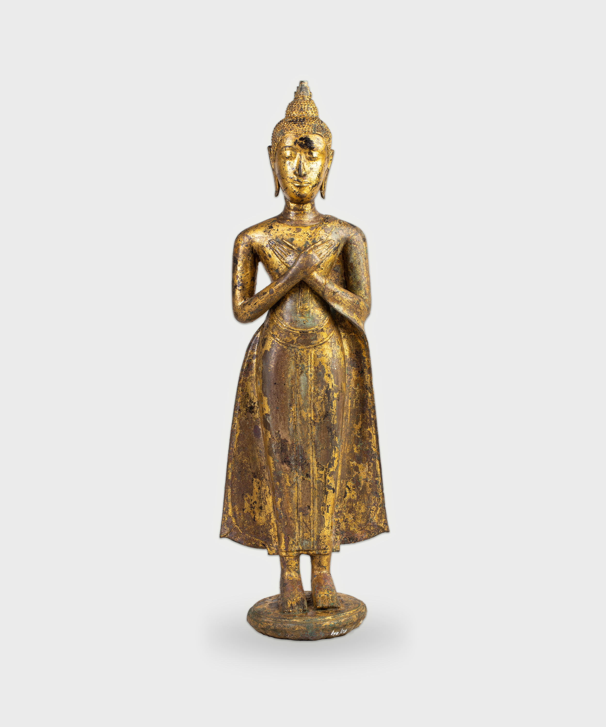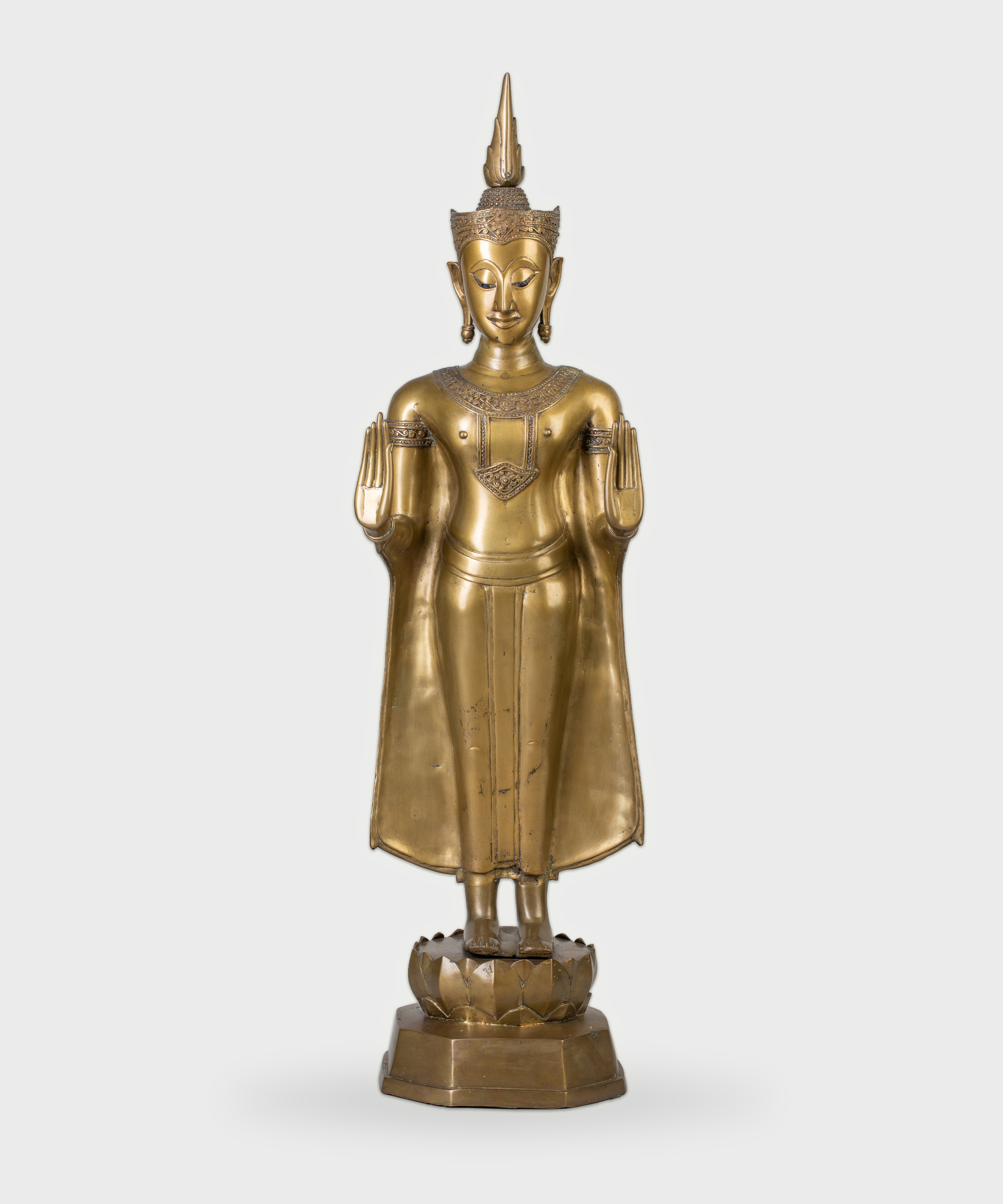 พระพุทธรูปยืนไขว้พระหัตถ์ทั้งสองข้างทับกันบริเวณพระอุระ แสดงเหตุการณ์ตามพุทธประวัติเมื่อครั้ง พระพุทธองค์ทรงรำพึงปริวิตกว่าพระธรรมที่ทรงตรัสรู้นั้น จะไม่สามารถเผยแผ่แก่สรรพสัตว์ให้เข้าใจได้โดยง่าย ท้าวสหัมบดีพรหมจึงมาเข้าเฝ้าพระพุทธองค์และกราบทูลอาราธนาให้พระองค์ทรงแสดงธรรมแก่สรรพสัตว์ พระพุทธองค์ทรงพิจารณาถึงความแตกต่างของเหล่าสรรพสัตว์เปรียบกับดอกบัว ๓ เหล่า และมีพระประสงค์ที่ จะเผยแผ่พระธรรมต่อไป