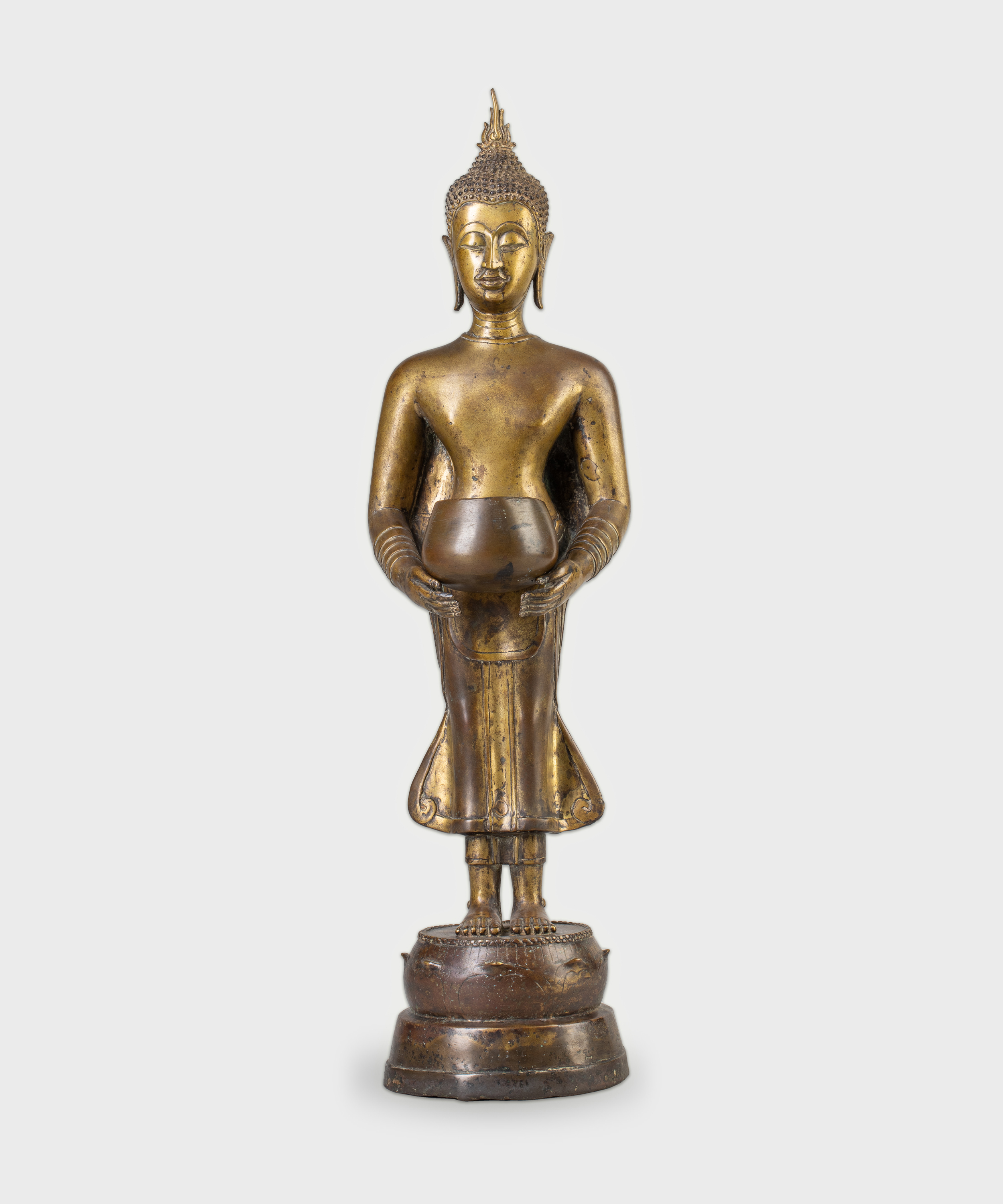 พระพุทธรูปอิริยาบถยื่นพระกรทั้งสองออกไปโอบรับบาตร ตามเหตุการณ์พระพุทธประวัติ เมื่อ พระพุทธเจ้าเสด็จมาถึงเมืองกบิลพัสดุ์ พระประยูรญาติจัดการรับเสด็จให้ประทับ ณ พระนิโครธารามวิหาร โดย มิได้มีตระกูลหนึ่งตระกูลใดกราบทูลให้รับภัตตาหารบิณฑบาตในเช้าวันรุ่งขึ้นไม่ พระพุทธองค์จึงเสด็จพร้อม พระสาวกเข้ามาบิณฑบาตภายในเมืองเพื่อโปรดเวไนยสัตว์ (ผู้ที่พึงสั่งสอนได้) ตามกิจของสงฆ์ เมื่อพระเจ้าสุทโธทนะทรงทราบจึงเสด็จออกไปอาราธนาพระพุทธเจ้าพร้อมด้วยเหล่าพระสงฆ์สาวกให้เข้าไปกระทำภัตกิจ เสวยภัตตาหารในพระมหามณเฑียร
