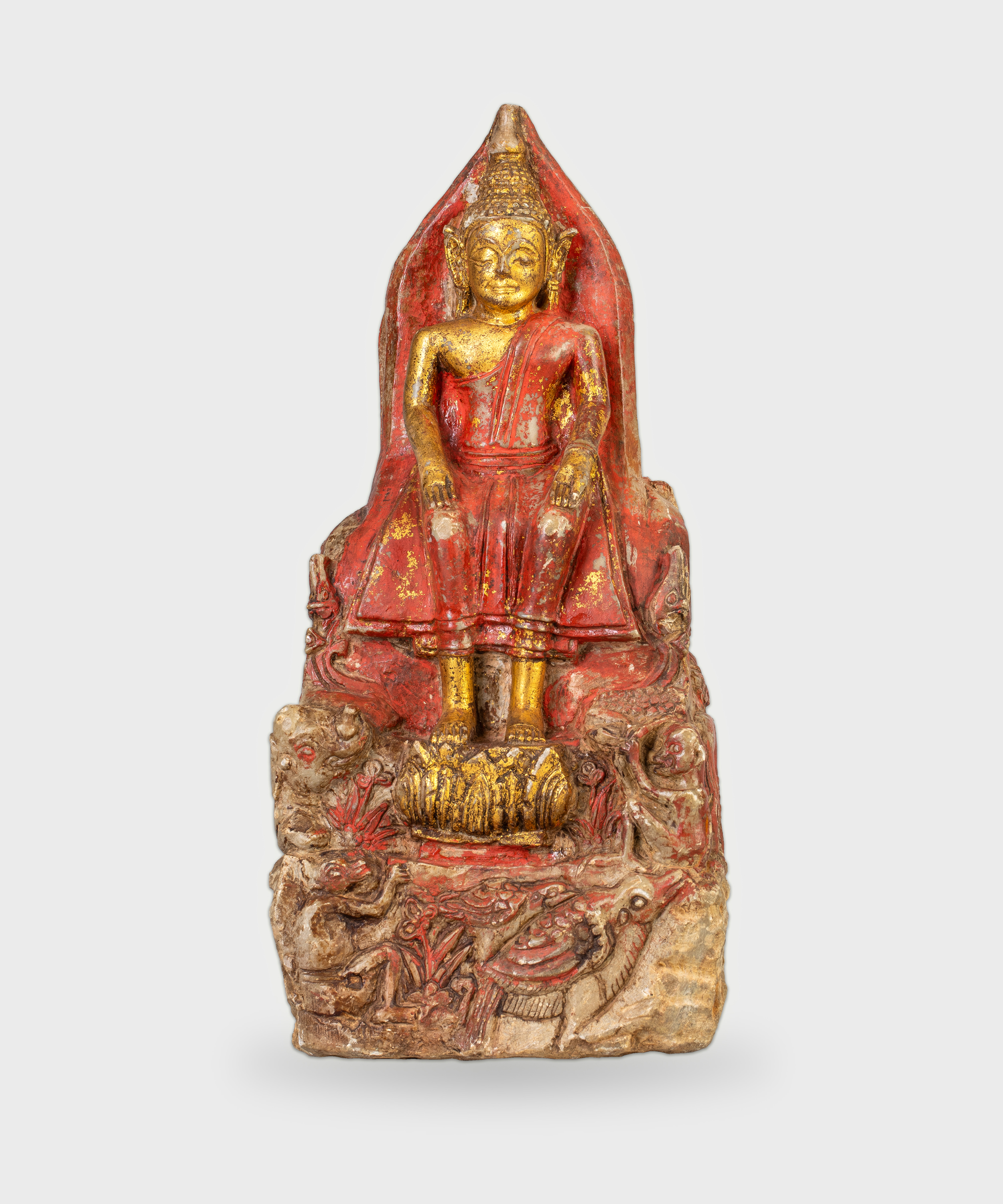 พระพุทธรูปประทับขัดสมาธิราบเหนือขนดนาค ๔ ชั้น เบื้องพระปฤษฎางค์เป็นลำตัวพญานาค ๗ เศียร แผ่พังพานปกเหนือพระเศียร ปางนาคปรก เหตุการณ์พุทธประวัติภายหลังจากตรัสรู้ในสัปดาห์ที่ ๖ พระ พุทธองค์เสด็จไปประทับบำเพ็ญสมาบัติ ณ ร่มไม้จิก (มุจลินทพฤกษ์) ขณะนั้นฝนได้ตกพรำอยู่ตลอด ๗ วัน พญานาคตนหนึ่งชื่อมุจลินทนาคราชอาศัยอยู่ในสระใหญ่ใกล้ ๆ ที่นั้น ได้ขึ้นมาแผ่พังพานและขดกายล้อมพระ สัมมาสัมพุทธเจ้าไม่ให้ถูกหมอกน้ำค้าง ลมและน้ำฝน กระทั่งฝนหยุดตกจึงแปลงกายเป็นมาณพเข้าไปเฝ้าพระพุทธเจ้า