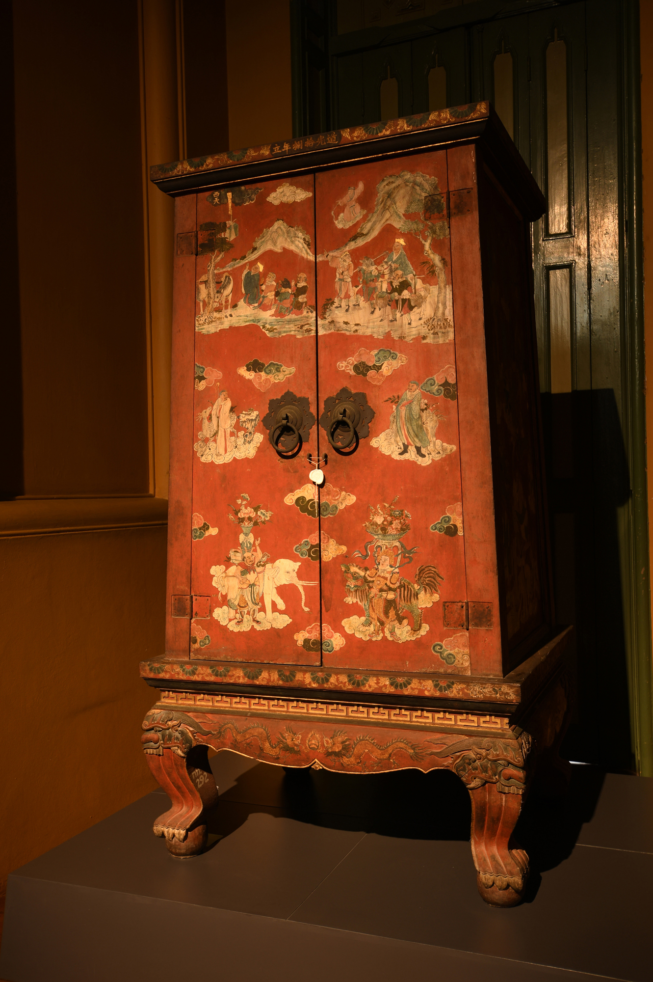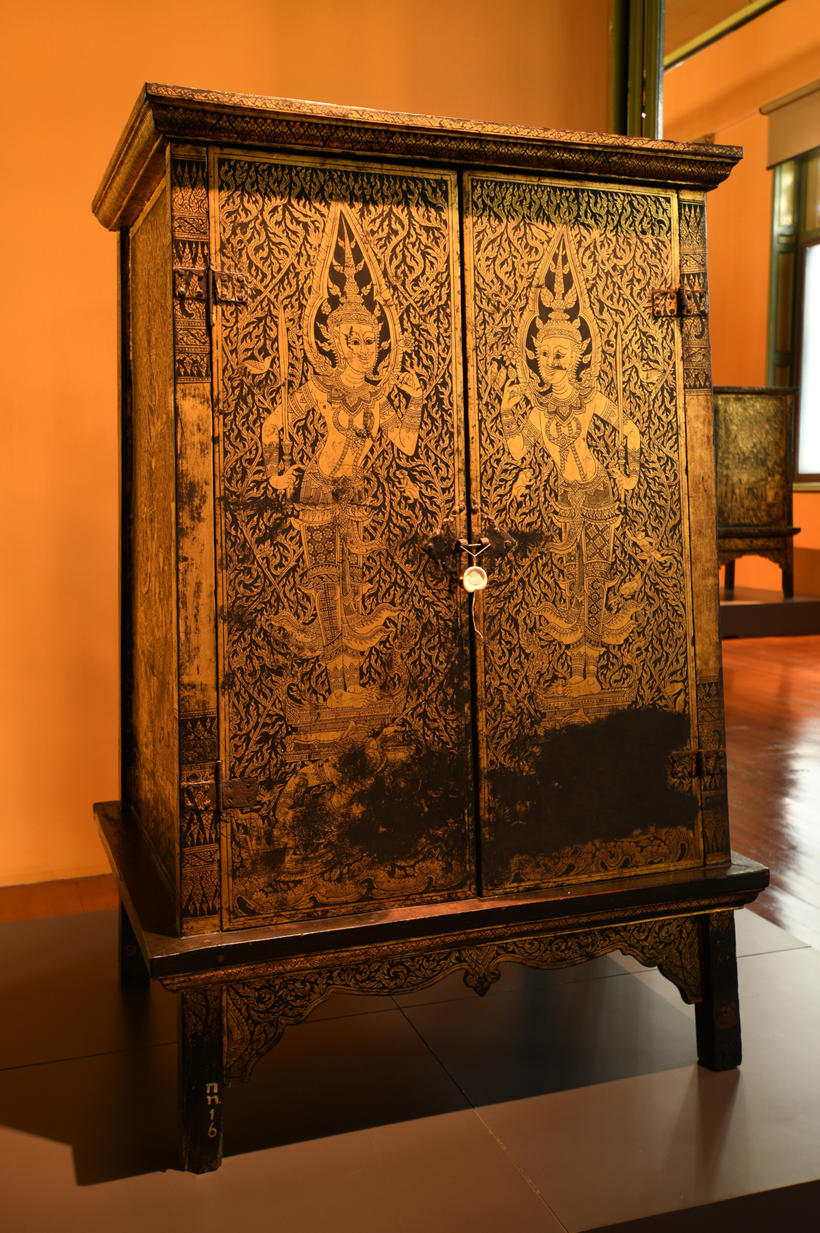 ห้องที่ ๖ จัดแสดงตู้พระธรรมที่มีลวดลายที่เป็นรูปทวารบาลทั้งไทยและจีน