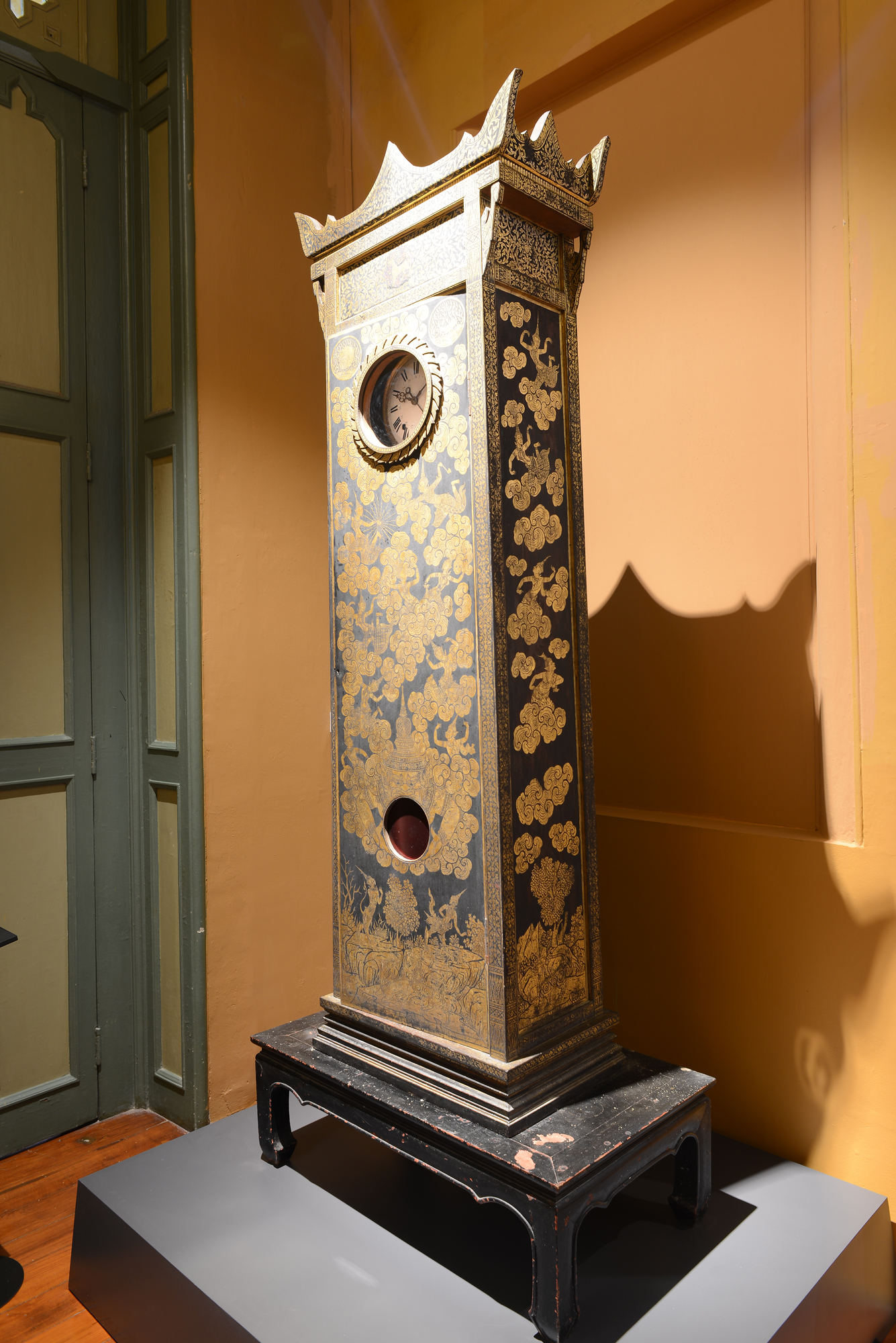 พุทธศาสนิกชนผู้ปรารถนาอุทิศตนสร้างผลงานอันวิจิตรงดงามสะท้อนผ่านพุทธศิลป์ชั้นเลิศด้วยฝีมือชั้นครูของช่างหลายแขนง สำหรับงานประณีตศิลป์บนตู้พระไตรปิฎกหรือตู้พระธรรมนั้น เป็นตัวอย่างของจิตรกรรมชั้นสูงที่เกี่ยวเนื่องกับศาสนวัตถุ ที่ช่างฝีมือสมัยโบราณบรรจงจำหลักเส้นสายที่งดงามและแช่มช้อย เพื่อบอกเล่าเรื่องราวคำสอนในพระพุทธศาสนาผ่านลวดลายต่าง ๆ เช่น ลายรดน้ำ ลายกำมะลอ ลวดลายเหล่านี้ประดับตกแต่งส่วนต่าง ๆ ของตู้ การจัดแสดงนิทรรศการในครั้งนี้ มีเนื้อหาเกี่ยวกับตู้พระธรรมในสมัยรัตนโกสินทร์ โดยจัดแสดงตู้พระธรรม จำนวน ๔๗ ตู้ และนาฬิกา ๑ เรือน แบ่งการจัดแสดงออกเป็น