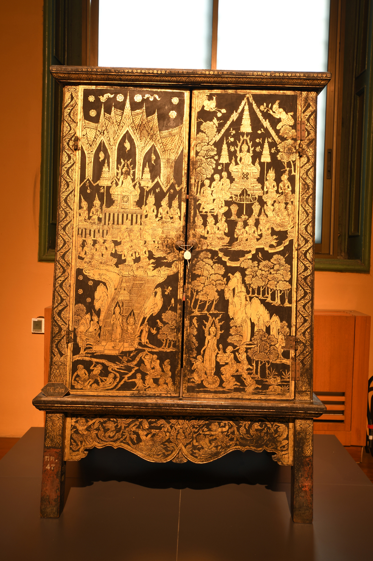 ห้องที่ ๗ จัดแสดงตู้พระธรรมที่มีลวดลายเรื่องพุทธประวัติ