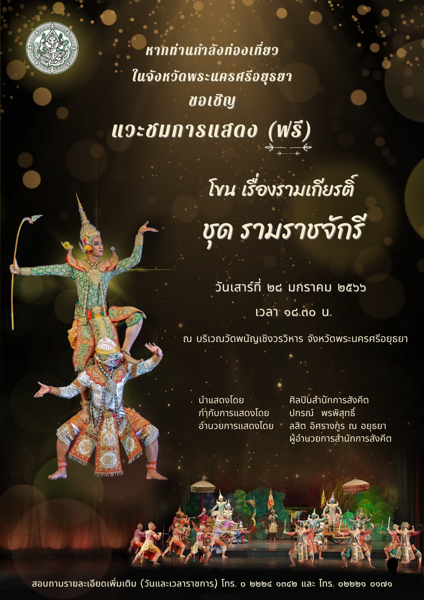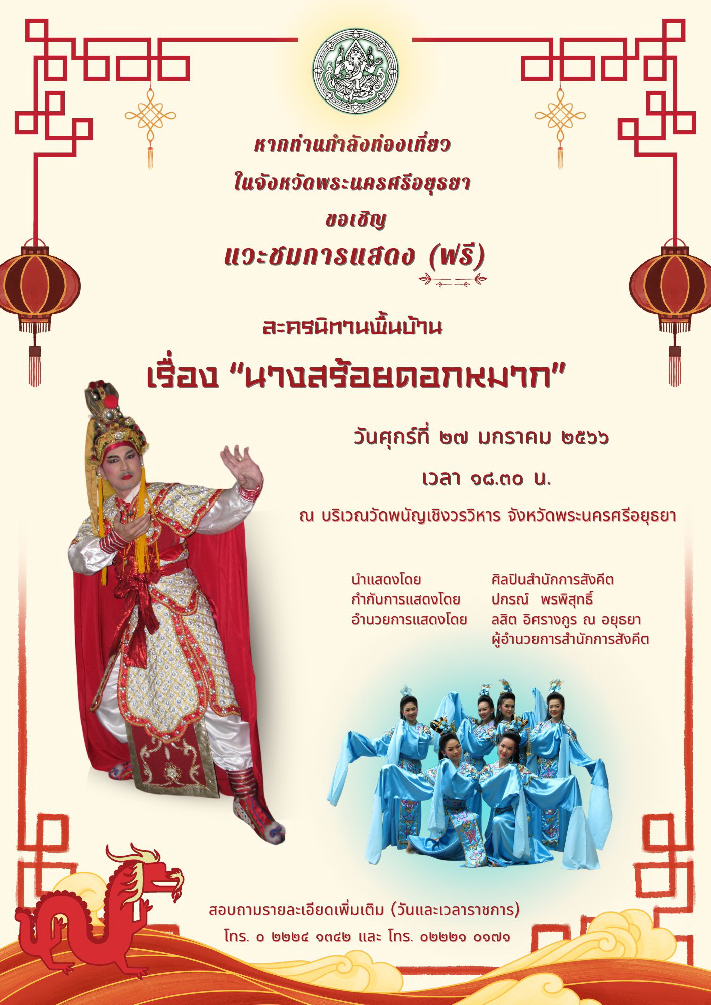 สำนักการสังคีต จัดการแสดงนาฏศิลป์และดนตรีสัญจร ณ วัดพนัญเชิงวรวิหาร ตำบลคลองสวนพลู อำเภอเมือง จังหวัดพระนครศรีอยุธยา ระหว่างวันที่ ๒๗ – ๒๘ มกราคม ๒๕๖๖ เวลา ๑๘.๓๐ น. ขอเชิญชมการแสดงละครนิทานพื้นบ้าน เรื่อง “นางสร้อยดอกหมาก” ในวันที่ ๒๗ มกราคม ๒๕๖๖ และการแสดงโขน เรื่องรามเกียรติ์ ชุด รามราชจักรี ในวันที่ ๒๘ มกราคม ๒๕๖๖ นำแสดงโดยศิลปินสำนักการสังคีต กำกับการแสดงโดย ปกรณ์ พรพิสุทธิ์ อำนวยการแสดงโดย ลสิต อิศรางกูร ณ อยุธยา ผู้อำนวยการสำนักการสังคีต