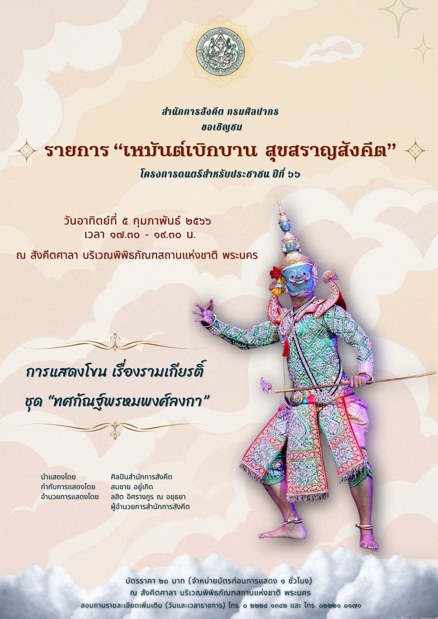 สำนักการสังคีต ขอเชิญชมรายการ “เหมันต์เบิกบาน สุขสราญสังคีต” โครงการดนตรีสำหรับประชาชน ปีที่ ๖๖ วันอาทิตย์ที่ ๕ กุมภาพันธ์ ๒๕๖๖ เวลา ๑๗.๓๐ - ๑๙.๓๐ น. การแสดงโขน เรื่องรามเกียรติ์ ชุด “ทศกัณฐ์พรหมพงศ์ลงกา” ณ สังคีตศาลา บริเวณพิพิธภัณฑสถานแห่งชาติ พระนคร นำแสดงโดย ศิลปินสำนักการสังคีต กำกับการแสดงโดย นายสมชาย อยู่เกิด อำนวยการแสดงโดย นายลสิต อิศรางกูร ณ อยุธยา ผู้อำนวยการสำนักการสังคีต