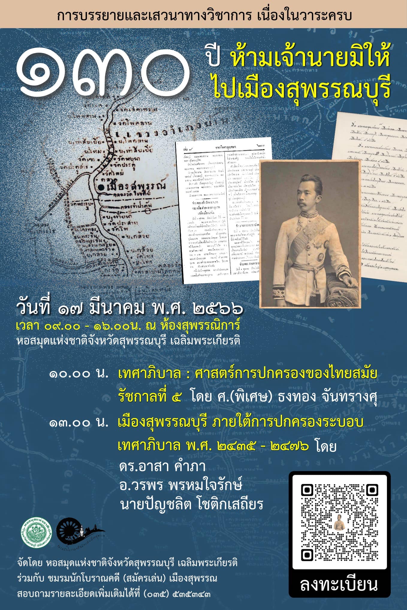 ขอเชิญร่วมฟังบรรยายและเสวนาเนื่องในวาระครบ 130 ปี ห้ามเจ้านายมิให้ไปเมืองสุพรรณบุรี "เทศาภิบาล : ศาสตร์การปกครองของไทย"สมัยรัชกาลที่ 5