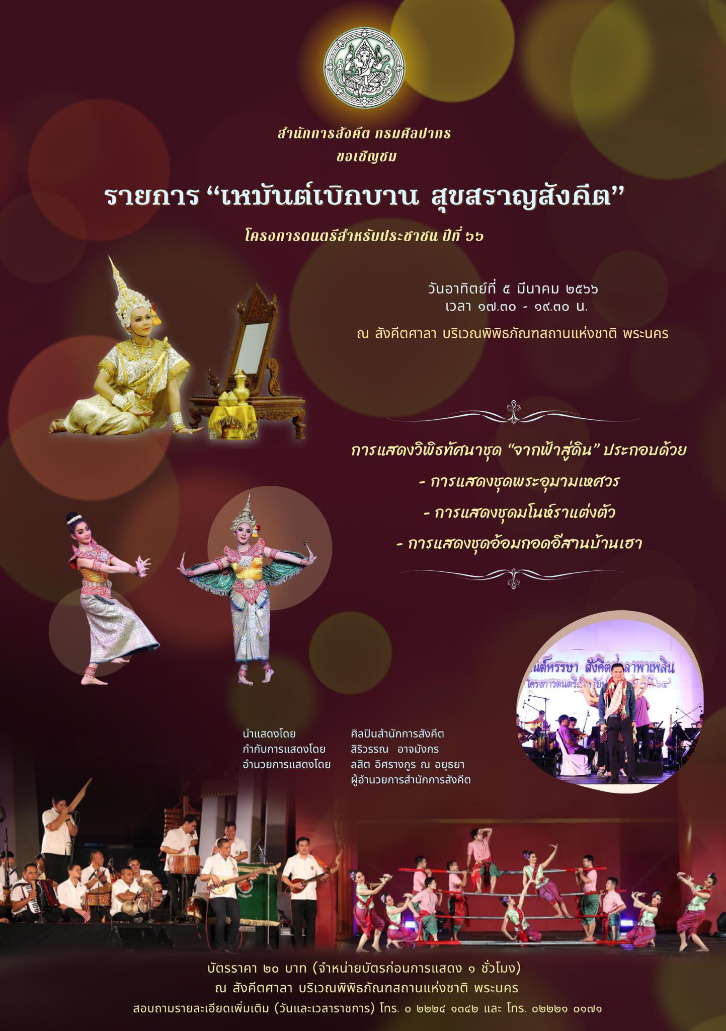 สำนักการสังคีต กรมศิลปากร ขอเชิญชม รายการ“เหมันต์เบิกบาน สุขสราญสังคีต” โครงการดนตรีสำหรับประชาชน ปีที่ ๖๖ วันอาทิตย์ที่ ๕ มีนาคม ๒๕๖๖ เวลา ๑๗.๓๐ - ๑๙.๓๐ น. พบกับการแสดงวิพิธทัศนาชุด “จากฟ้าสู่ดิน” ประกอบด้วย - การแสดงชุดพระอุมามเหศวร - การแสดงชุดมโนห์ราแต่งตัว - การแสดงชุดอ้อมกอดอีสานบ้านเฮา นำแสดงโดย ศิลปินสำนักการสังคีต / กำกับการแสดงโดย สิริวรรณ อาจมังกร / อำนวยการแสดงโดย ลสิต อิศรางกูร ณ อยุธยา ผู้อำนวยการสำนักการสังคีต
