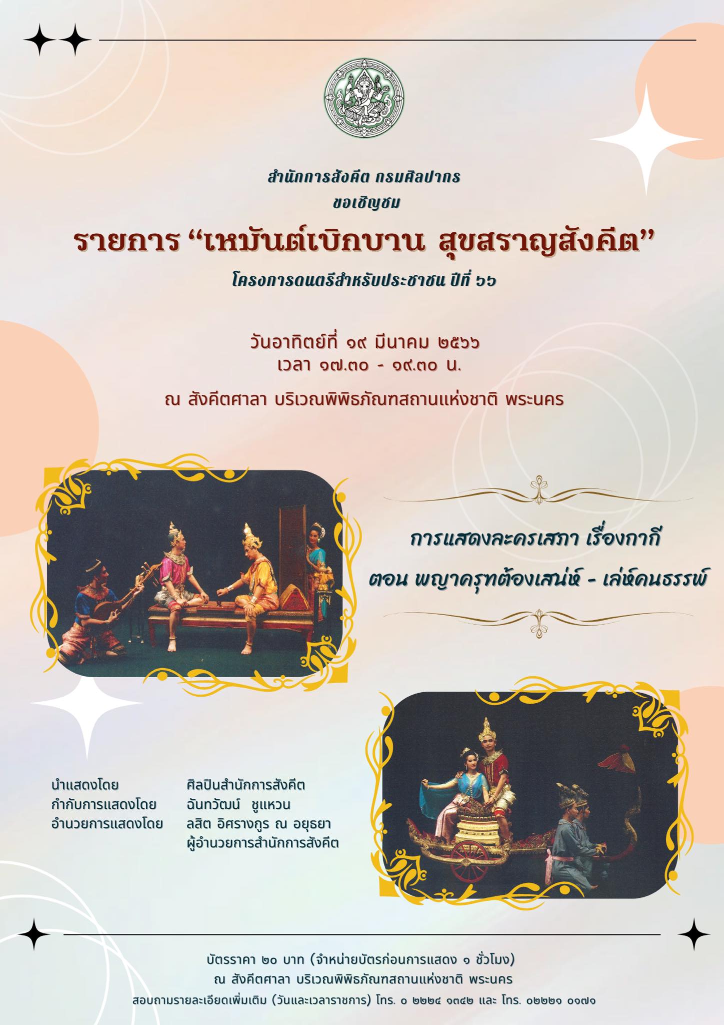 สำนักการสังคีต กรมศิลปากร ขอเชิญชมรายการ “เหมันต์เบิกบาน สุขสราญสังคีต” โครงการดนตรีสำหรับประชาชน ปีที่ ๖๖ วันอาทิตย์ที่ ๑๙ มีนาคม ๒๕๖๖ เวลา ๑๗.๓๐ - ๑๙.๓๐ น. พบการแสดงละครเสภา เรื่องกากี ตอน พญาครุฑต้องเสน่ห์ - เล่ห์คนธรรพ์ นำแสดงโดยศิลปินสำนักการสังคีต