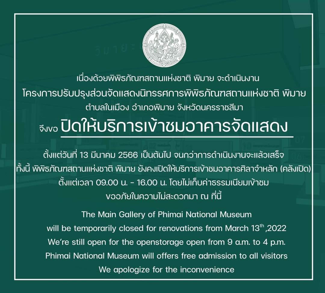 พิพิธภัณฑสถานแห่งชาติ พิมาย แจ้งปิดให้บริการเข้าชมอาคารจัดแสดงหลัก เริ่ม ๑๓ มีนาคม ๒๕๖๖ เป็นต้นไป