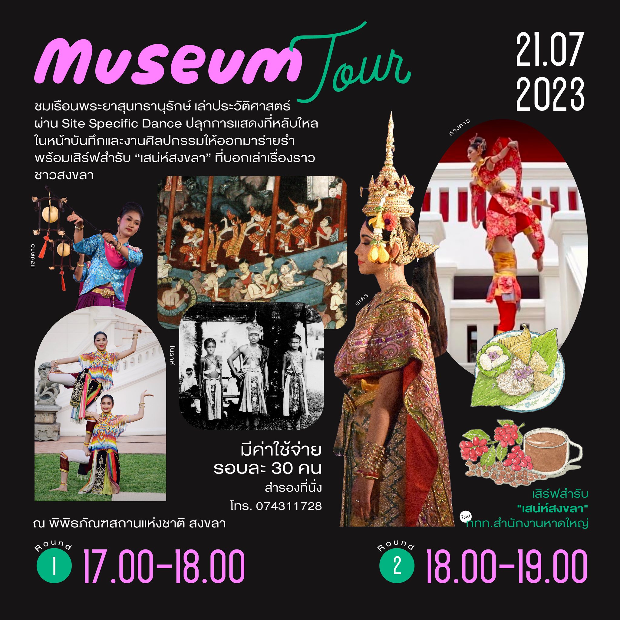 Museum Tour ประสบการณ์ใหม่ในการชมพิพิธภัณฑสถานแห่งชาติ สงขลา ที่ครบทั้ง “รูป รส กลิ่น เสียง” เล่าประวัติศาสตร์ ผ่าน Site Specific Dance โดยคณะศิลปกรรมศาสตร์ มหาวิทยาลัยทักษิณ ปลุกการแสดงที่หลับใหลในหน้าบันทึกและงานศิลปกรรมให้ออกมาร่ายรำ พร้อมเสิร์ฟสำรับ “เสน่ห์สงขลา” ที่บอกเล่าเรื่องราวชาวสงขลา โดยการท่องเที่ยวแห่งประเทศไทย สำนักงานหาดใหญ่