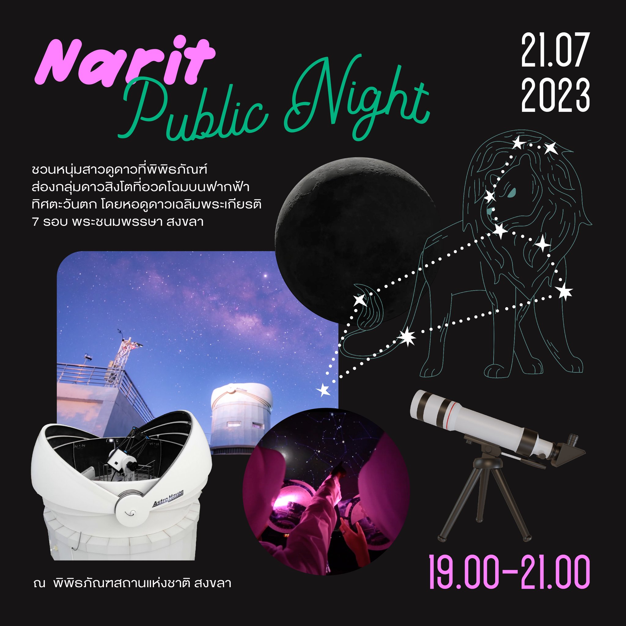 NARIT Public Night ชวนหนุ่มสาวดูดาว เล่าเรื่องราวจากระเบียงพิพิธภัณฑ์ ส่องดวงจันทร์ขึ้น 4 ค่ำ และกลุ่มดาวสิงโตที่อวดโฉมบนฟากฟ้าทิศตะวันตก โดยหอดูดาวเฉลิมพระเกียรติ 7 รอบ พระชนมพรรษา สงขลา ตั้งแต่เวลา 19.00น.-21.00น.