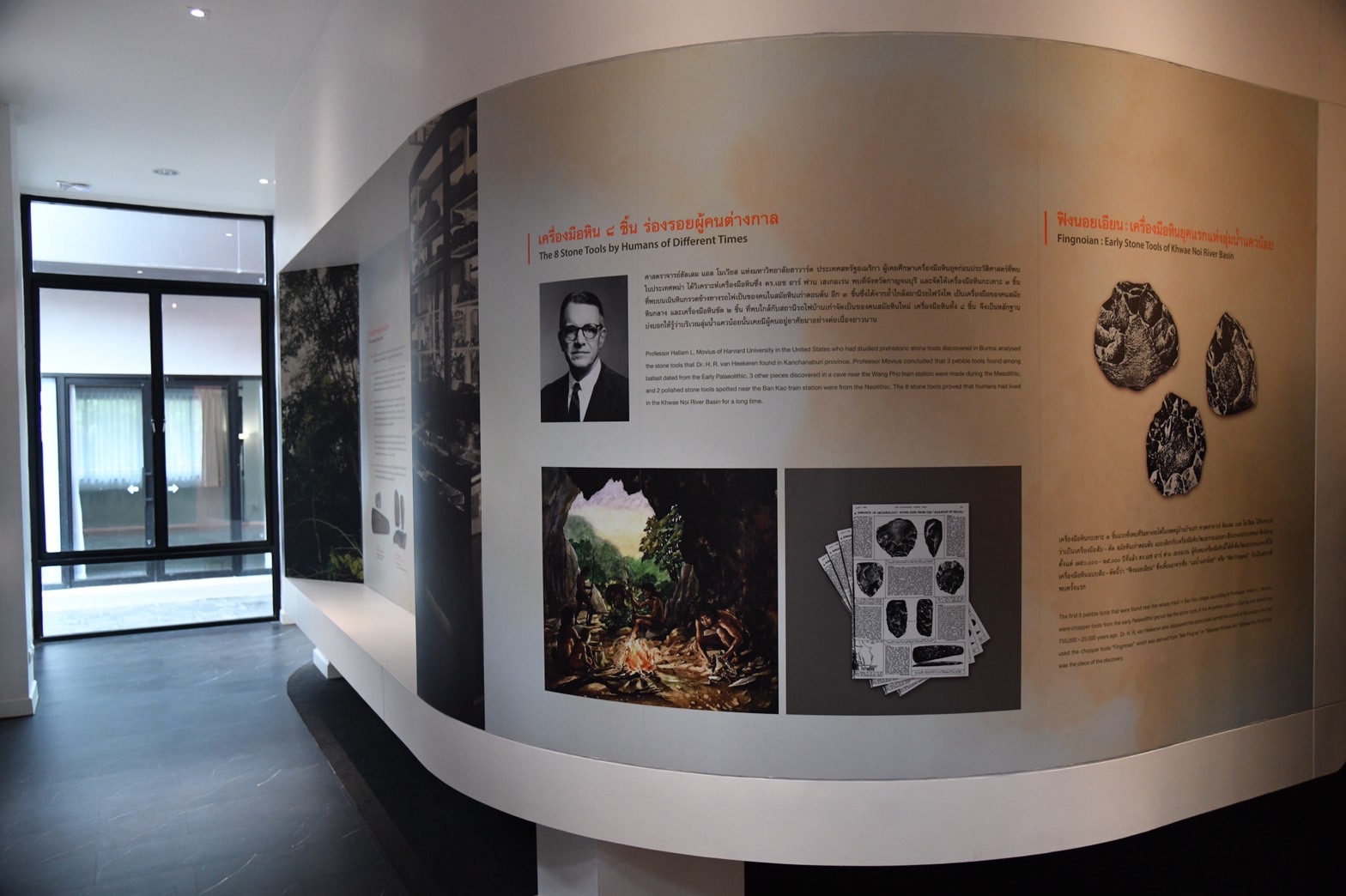 การจัดแสดงชั้นที่ ๑ นำเสนอวีดีทัศน์ “การค้นพบแหล่งโบราณคดีบ้านเก่า” การค้นพบเครื่องมือหิน ๘ ชิ้น นำไปสู่การขุดค้นทางโบราณคดีอย่างเป็นทางการที่แหล่งโบราณคดีบ้านเก่า จังหวัดกาญจนบุรี ข้อมูลหลักฐานและองค์ความรู้เกี่ยวกับคนบ้านเก่าในสมัยก่อนประวัติศาสตร์ ตลอดจนพัฒนาการของผู้คนในลุ่มน้ำแควน้อย – แควใหญ่ ที่สืบเนื่องมาจากสมัยหินเก่า สู่สมัยหินใหม่ และบ้านเก่าในปัจจุบัน