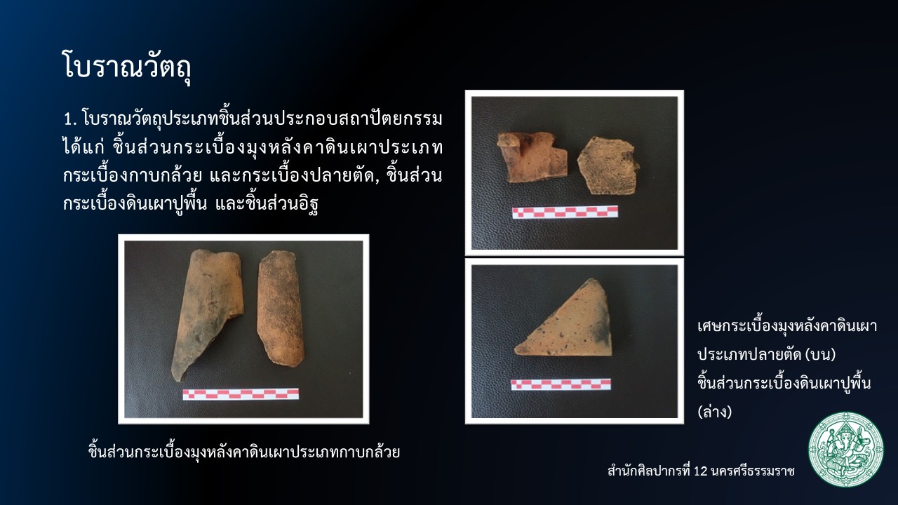 1. โบราณวัตถุประเภทชิ้นส่วนประกอบสถาปัตยกรรม ได้แก่ ชิ้นส่วนกระเบื้องมุงหลังคาดินเผาประเภทกระเบื้องกาบกล้วย และกระเบื้องปลายตัด, ชิ้นส่วนกระเบื้องดินเผาปูพื้น และชิ้นส่วนอิฐ