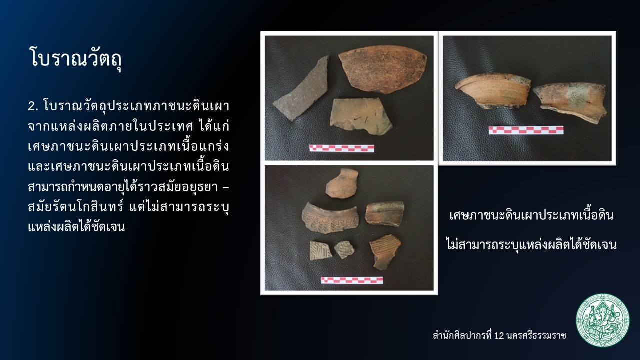 2. โบราณวัตถุประเภทภาชนะดินเผาจากแหล่งผลิตภายในประเทศ ได้แก่ เศษภาชนะดินเผาประเภทเนื้อแกร่ง และเศษภาชนะดินเผาประเภทเนื้อดิน สามารถกำหนดอายุได้ราวสมัยอยุธยา – สมัยรัตนโกสินทร์ แต่ไม่สามารถระบุแหล่งผลิตได้ชัดเจน