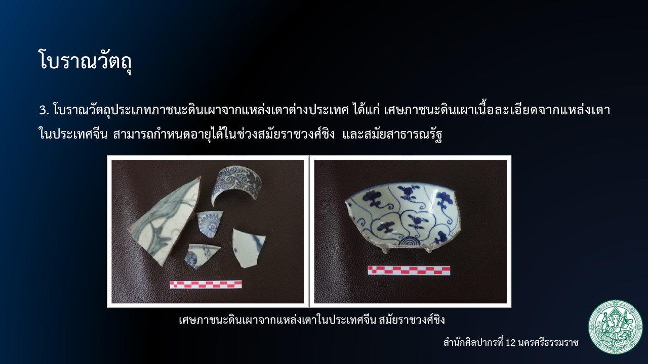 เศษภาชนะดินเผาเนื้อละเอียดจากแหล่งเตาในประเทศจีน สามารถกำหนดอายุได้ในช่วงสมัยราชวงศ์ชิง และสมัยสาธารณรัฐ