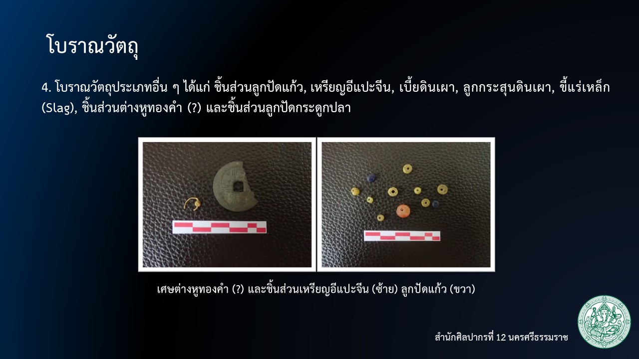 4. โบราณวัตถุประเภทอื่น ๆ ได้แก่ ชิ้นส่วนลูกปัดแก้ว, เหรียญอีแปะจีน, เบี้ยดินเผา, ลูกกระสุนดินเผา, ขี้แร่เหล็ก (Slag), ชิ้นส่วนต่างหูทองคำ (?) และชิ้นส่วนลูกปัดกระดูกปลา