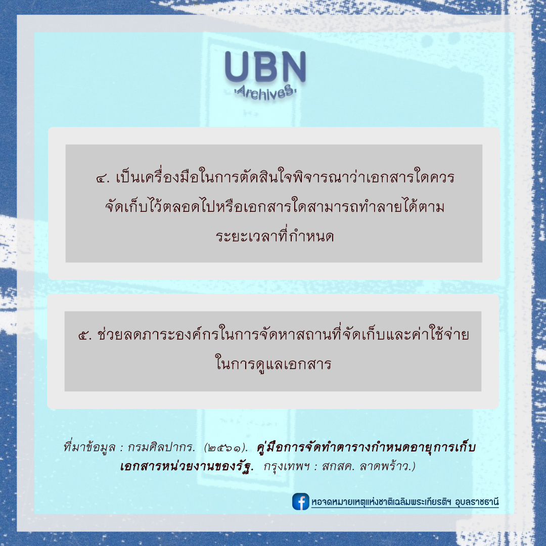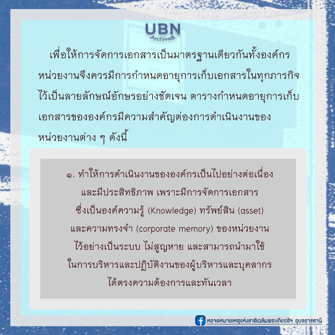Q : ข้อใดไม่ใช่ประโยชน์ของการจัดทำตารางการกำหนดอายุการเก็บเอกสาร