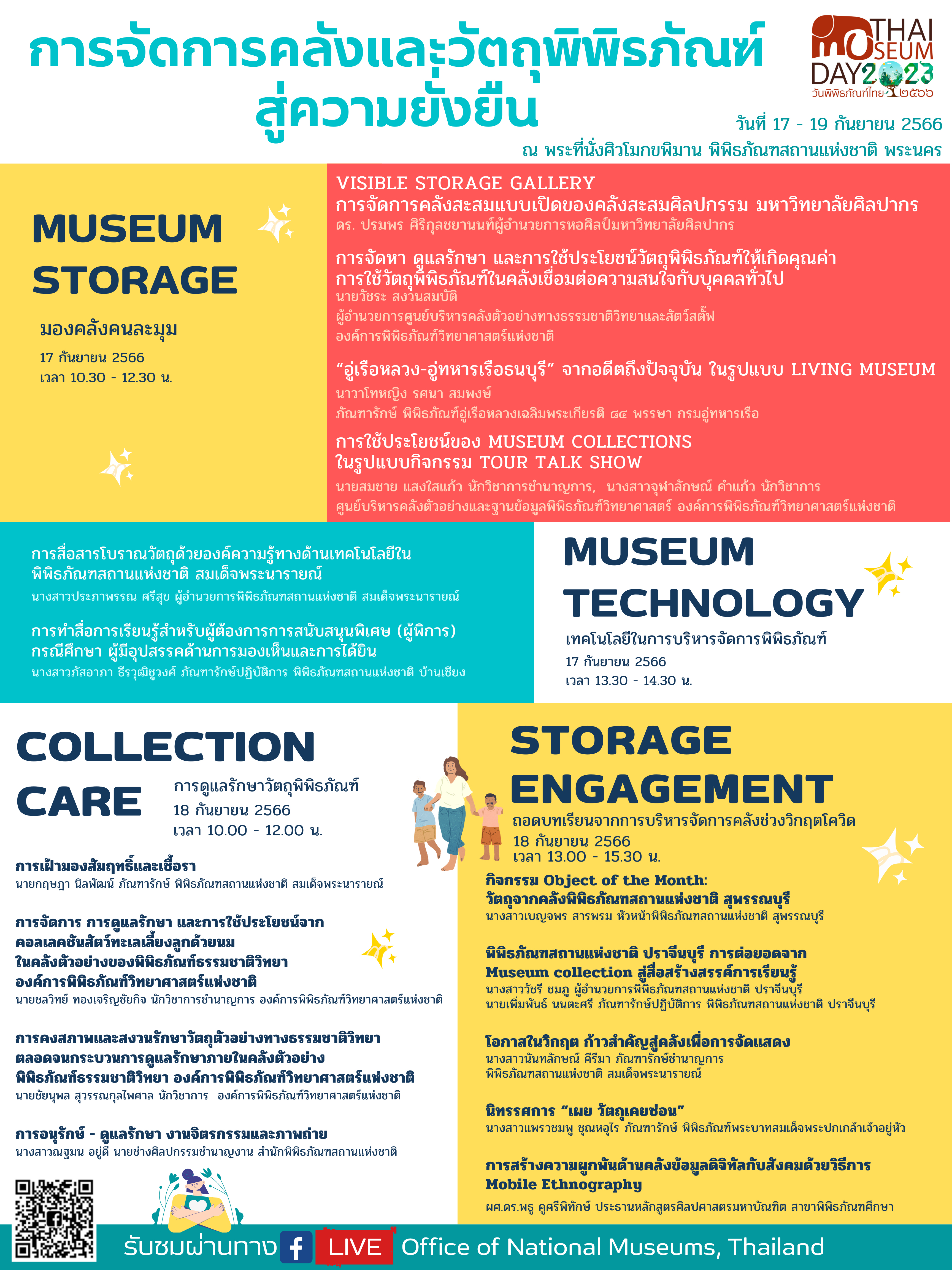 เนื่องในวันพิพิธภัณฑ์ไทย 2566 (Thai Museum Day 2023) กรมศิลปากร โดยสำนักพิพิธภัณฑสถานแห่งชาติ ร่วมกับเครือข่ายพิพิธภัณฑ์ไทย จึงจัดกิจกรรมเพื่อสังคมในมิติของความยั่งยืน ภายใต้หัวข้อ “การจัดการคลังและวัตถุพิพิธภัณฑ์สู่ความยั่งยืน” ด้วยเล็งเห็นว่าคลังพิพิธภัณฑ์และวัตถุพิพิธภัณฑ์เป็นหัวใจสำคัญของพิพิธภัณฑ์ การดูแลบริหารคลังพิพิธภัณฑ์และวัตถุพิพิธภัณฑ์อย่างมีประสิทธิภาพ จึงเปรียบเสมือนการสร้างความยั่งยืนแก่มรดกทางวัฒนธรรมของชาติและสังคม ภายในงานนี้ท่านจะได้พบกับกิจกรรมหลากหลายจากเครือข่ายพิพิธภัณฑ์ไทยทั่วประเทศ