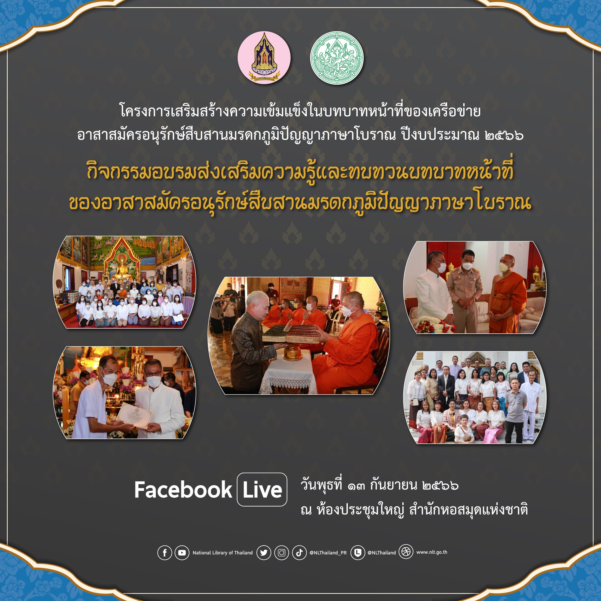 สำนักหอสมุดแห่งชาติ ขอเชิญเข้าร่วมรับชมการถ่ายทอดสดโครงการเสริมสร้างความเข้มแข็งในบทบาทหน้าที่ของเครือข่ายอาสาสมัครอนุรักษ์สืบสานมรดกภูมิปัญญาภาษาโบราณ ปีงบประมาณ 2566 "กิจกรรมอบรมส่งเสริมความรู้และทบทวนบทบาทหน้าที่ของอาสาสมัครอนุรักษ์สืบสานมรดกภูมิปัญญาภาษาโบราณ" ในวันที่ 13 กันยายน 2566 เวลา 09.00 น. ณ ห้องประชุมใหญ่ สำนักหอสมุดแห่งชาติ