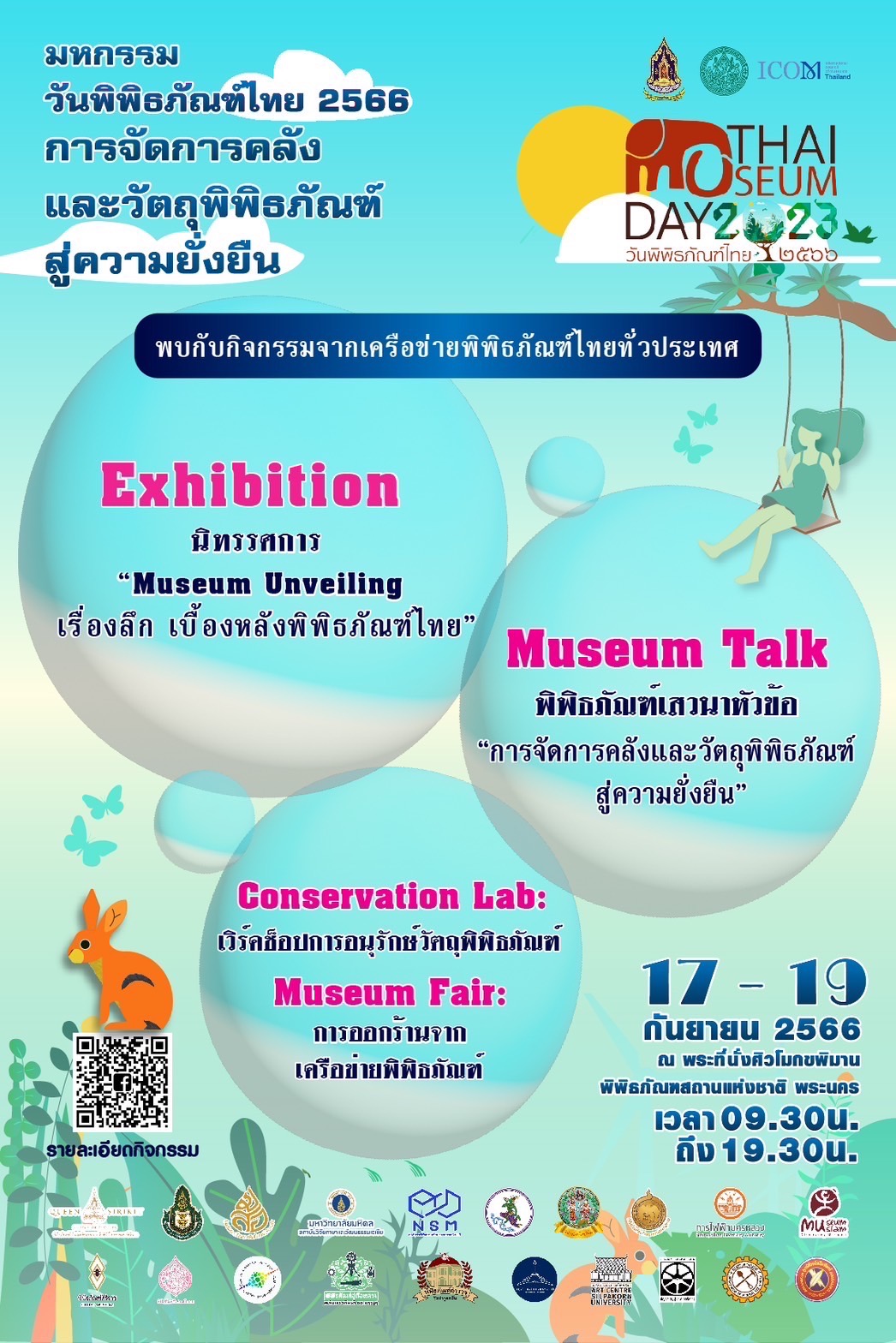 กิจกรรมเนื่องในวันพิพิธภัณฑ์ไทย 2566 Thai Museum Day 2023 ภายใต้หัวข้อ “การจัดการคลังและวัตถุพิพิธภัณฑ์สู่ความยั่งยืน” ระหว่างวันที่ 17 - 19 กันยายน 2566 เวลา 09.30 – 19.30 น. ณ พระที่นั่งศิวโมกขพิมาน พิพิธภัณฑสถานแห่งชาติ พระนคร โดยภายในงานจะได้พบกับกิจกรรมหลากหลายจากเครือข่ายพิพิธภัณฑ์ไทยทั่วประเทศ ได้แก่