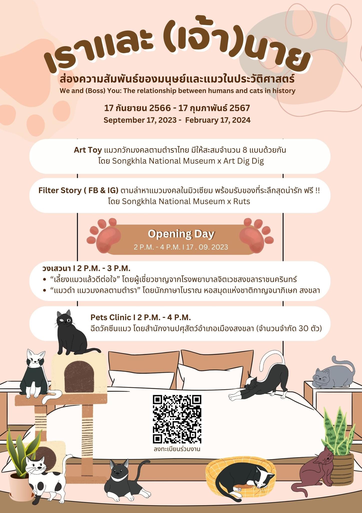 พิพิธภัณฑสถานแห่งชาติ สงขลา ชวนมาพบกับนิทรรศการพิเศษ “เราและ (เจ้า) นาย: ส่องความสัมพันธ์ของมนุษย์และแมวในประวัติศาสตร์” ที่น้องแมวจะเป็นผู้เล่าสายสัมพันธ์อันยาวไกลระหว่างสองสายพันธุ์ด้วยตัวเอง พร้อมกับเตรียมกิจกรรมพิเศษให้ทุกคนได้ร่วมสนุกสนานไปกับการเดินทางในครั้งนี้ อาทิ