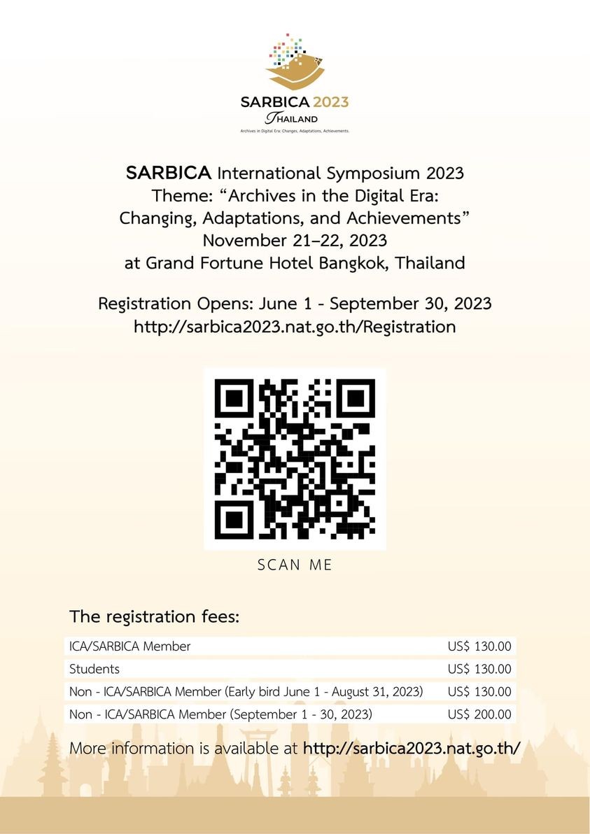 สำนักหอจดหมายเหตุแห่งชาติ ขอเชิญผู้สนใจร่วมการสัมมนา SARBICA International Symposium 2023 สภาการจดหมายเหตุระหว่างประเทศประจำภาคพื้นเอเชียตะวันออกเฉียงใต้ (Southeast Asia Regional Branch of the International Council on Archives: SARBICA) ร่วมกับสำนักหอจดหมายเหตุแห่งชาติ กรมศิลปากร ขอเชิญผู้สนใจเข้าร่วมการสัมมนาทางวิชาการ SARBICA International Symposium 2023 หัวข้อ “งานจดหมายเหตุในยุคดิจิทัล: การเปลี่ยนแปลง การปรับตัว และก้าวต่อไปของจดหมายเหตุ” (Archives in the Digital Era: Changing, Adaptations, and Achievements) ระหว่างวันที่ 21 – 22 พฤศจิกายน 2566 ณ โรงแรมแกรนด์ ฟอร์จูน กรุงเทพมหานคร เปิดรับลงทะเบียนตั้งแต่บัดนี้ถึงวันที่ 30 กันยายน 2566 รายละเอียดเพิ่มเติมที่ http://sarbica2023.nat.go.th